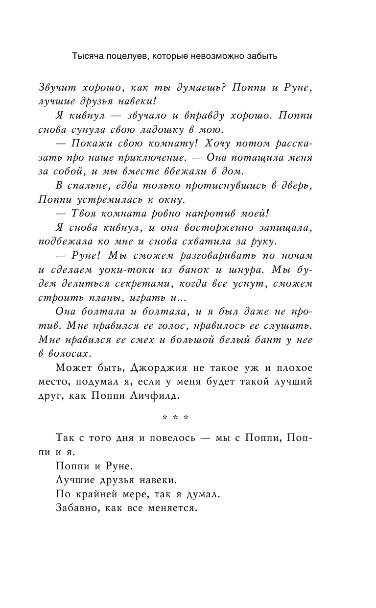 История о Поппи и Руне, которые росли бок о бок и обещали друг другу быть вместе всегда, но Руне вынужден уехать с семьей в Норвегию на 2 года. Он был очень удивлен, когда по приезде понимает, что Поппи больше не хочет его видеть! Эта мысль разъедает изнутри. Однако, узнав правду, он чувствует, что самое тяжелое испытание еще впереди. Может ли тысяча поцелуев спасти целую жизнь?