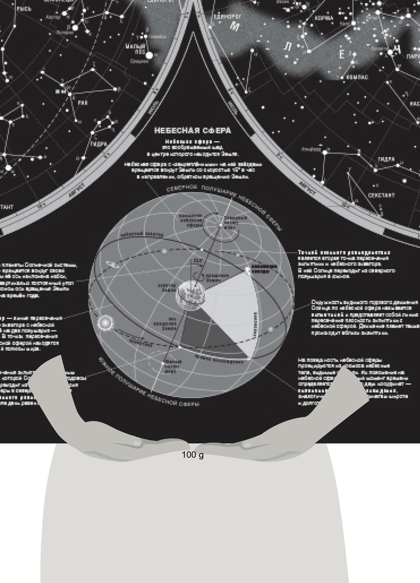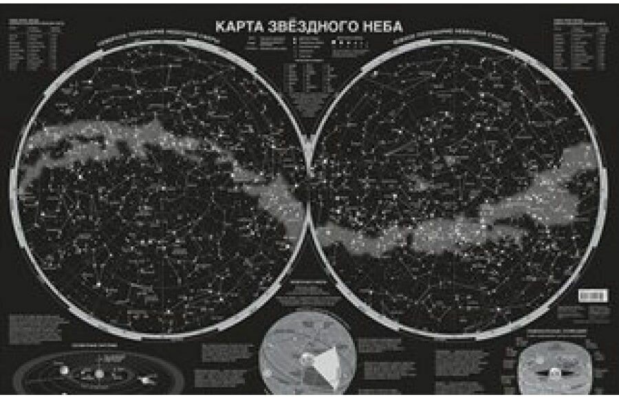 На настенной карте размером 1170х790 мм звёздное небо показано в виде карт северного и южного полушарий небесной сферы. Так ночное небо с мерцающими на нём галактиками, туманностями и звёздными скоплениями выглядит с Северного и Южного полюсов Земли.