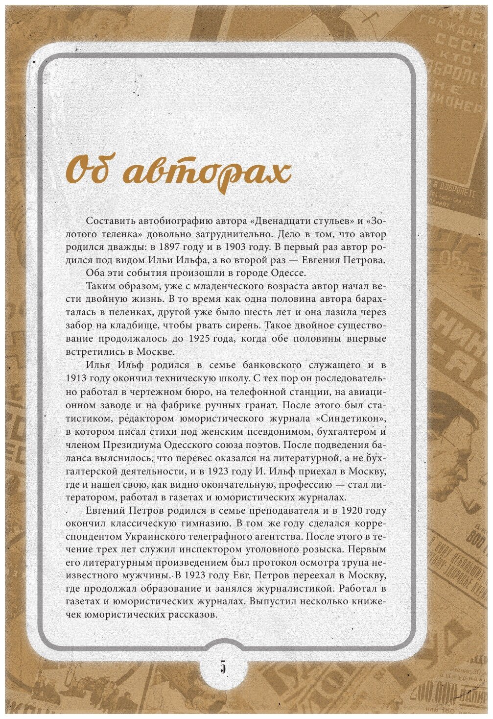 В книге "Двенадцать стульев" просто ужасающее количество опечаток. Начинаются опечатки уже в первом абзаце первой главы - читать невозможно. В книге "Золотой телёнок" опечаток мало - в пределах разумного - примерно 2-3. Иллюстрации (фото) в книге не всегда соответствуют эпохе. Цитаты к этим фотографиям приведены без пояснений (чьи это слова, откуда? непонятно). Очень интересно изложены исторические факты про авторов с приложением исторических фотографий (две вставки в книге). Книга очень качественная по оформлению, шикарная бумага, но все положительные моменты "убиваются" опечатками. Поэтому своих денег книга не стоит.