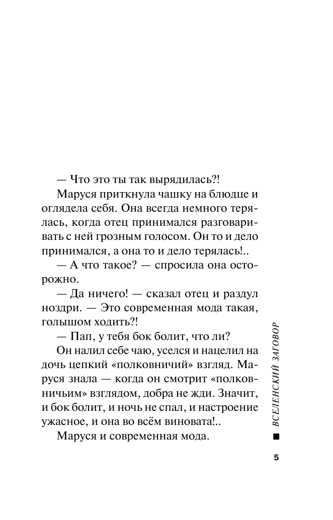 Вселенский заговор. Книга мне понравилась. В ней две части ли повести, в первой идет знакомство с героями и обстановкой, действие разворачивается медленно. Во второй она развивается и ускоряется. задумка интеерсная. сюжет вкусный, интрига захватывающая. провела за чтением три вечера, пока еала домой с работы, даже никого не замечала вокруг, за что спасибо Татьяне Устиновой.
