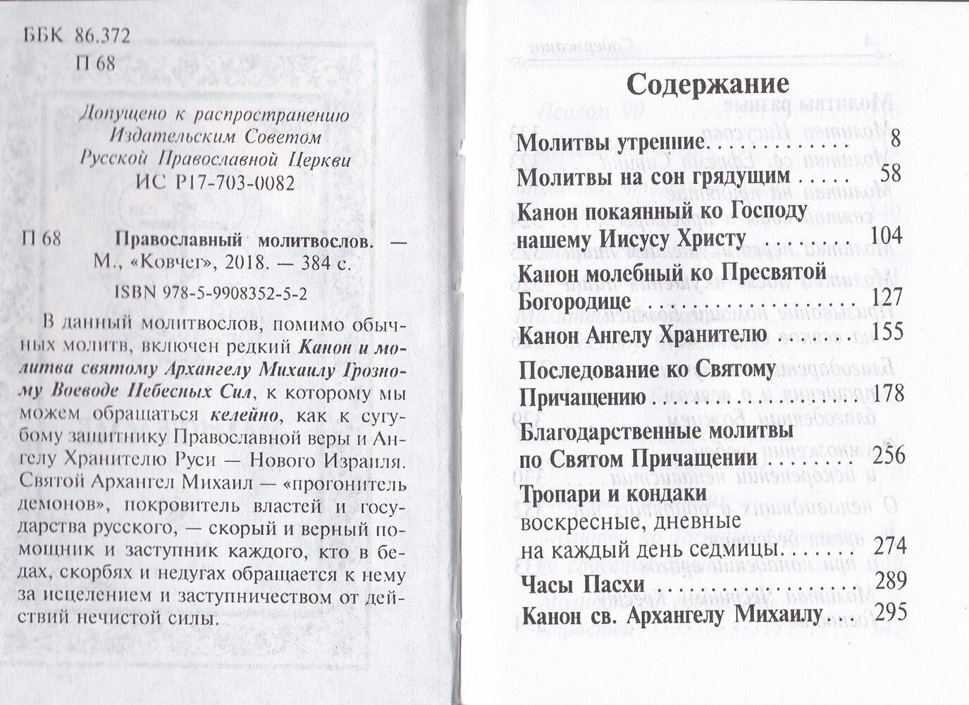 В данный молитвослов, напечатанный гражданским шрифтом, помимо основных молитв, включены редкий Канон и молитва святому Архангелу Михаилу Грозному Воеводе Небесных Сил, к которому мы можем обращаться келейно, как к сугубому защитнику Православной веры и Ангелу Хранителю Руси. Святой Архангел Михаил - "прогонитель демонов", покровитель властей и государства русского, - скорый и верный помощник и заступник каждого, кто в бедах, скорбях и недугах обращается к нему за исцелением и заступничеством от действий нечистой силы.