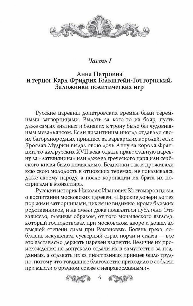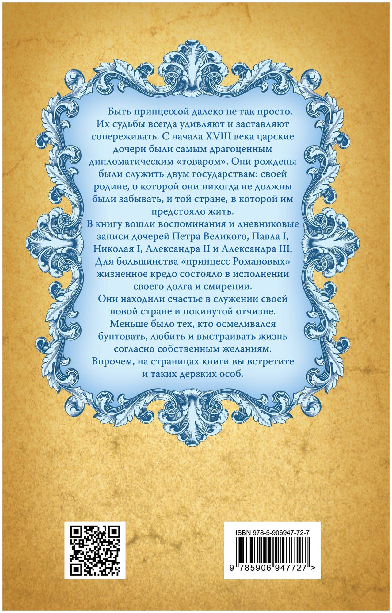 Быть принцессой далеко не так просто. Их судьбы всегда удивляют и заставляют сопереживать. С начала XVIII века царские дочери были самым драгоценным дипломатическим "товаром". Они рождены были служить двум государствам: своей родине, о которой они никогда не должны были забывать, и той стране, в которой им предстояло жить. В книгу вошли воспоминания и дневниковые записи дочерей Петра Великого, Павла I, Николая I, Александра II и Александра III. Для большинства "принцесс Романовых" жизненное кредо состояло в исполнении своего долга и смирении. Они находили счастье в служении своей новой стране и покинутой отчизне. Меньше было тех, кто осмеливался бунтовать, любить и выстраивать жизнь согласно собственным желаниям. Впрочем, на страницах книги вы встретите и не таких дерзких особ.
