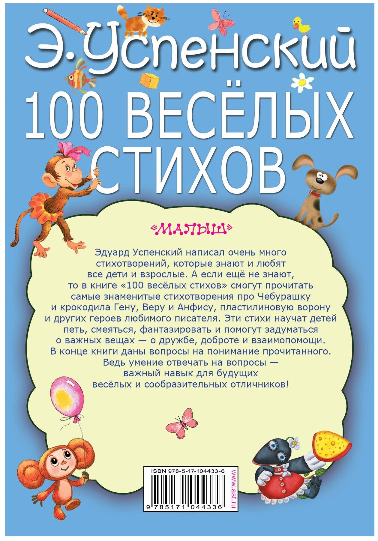 Эдуард Успенский написал очень много стихотворений, которые знают и любят все дети и взрослые. А если ещё не знают, то в книге "100 весёлых стихов" смогут прочитать самые знаменитые стихотворения про Чебурашку и крокодила Гену, Веру и Анфису, пластилиновую ворону и других героев любимого писателя. Эти стихи научат детей петь, смеяться, фантазировать и помогут задуматься о важных вещах - о дружбе, доброте и взаимопомощи. В конце книги даны вопросы на понимание прочитанного. Ведь умение отвечать на вопросы - важный навык для будущих весёлых и сообразительных отличников!