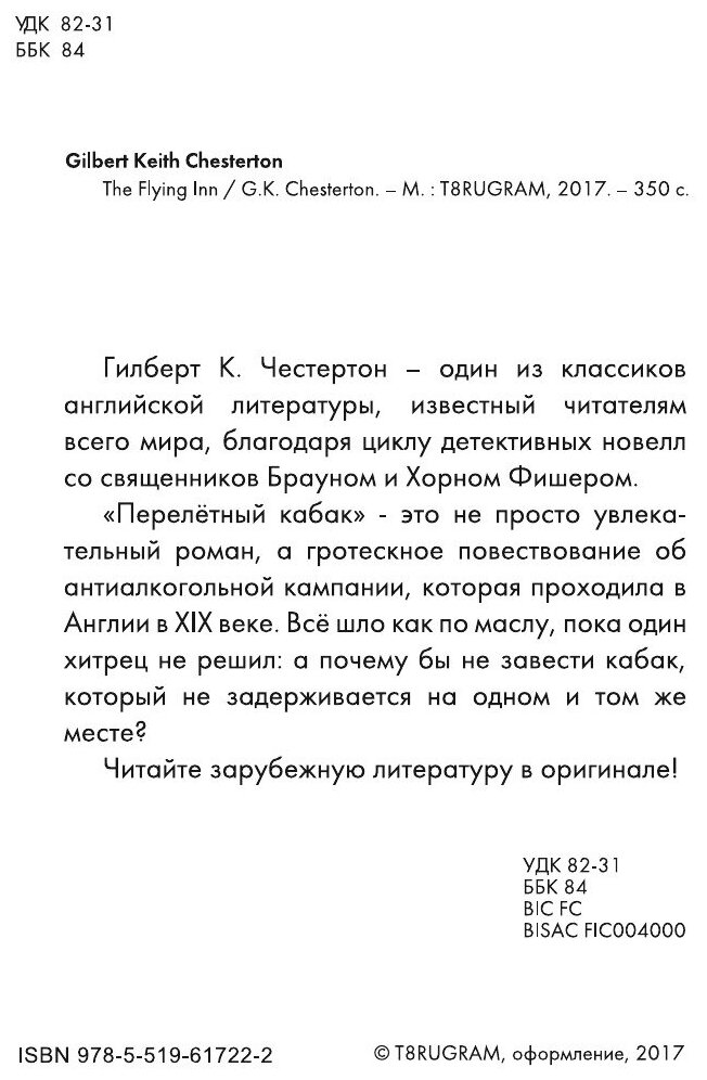 Гилберт К. Честертон - один из классиков английской литературы, известный читателям всего мира, благодаря циклу детективных новелл со священников Брауном и Хорном Фишером. "Перелётный кабак" - это не просто увлекательный роман, а гротескное повествование об антиалкогольной кампании, которая проходила в Англии в XIX веке. Всё шло как по маслу, пока один хитрец не решил: а почему бы не завести кабак, который не задерживается на одном и том же месте? Читайте зарубежную литературу в оригинале!