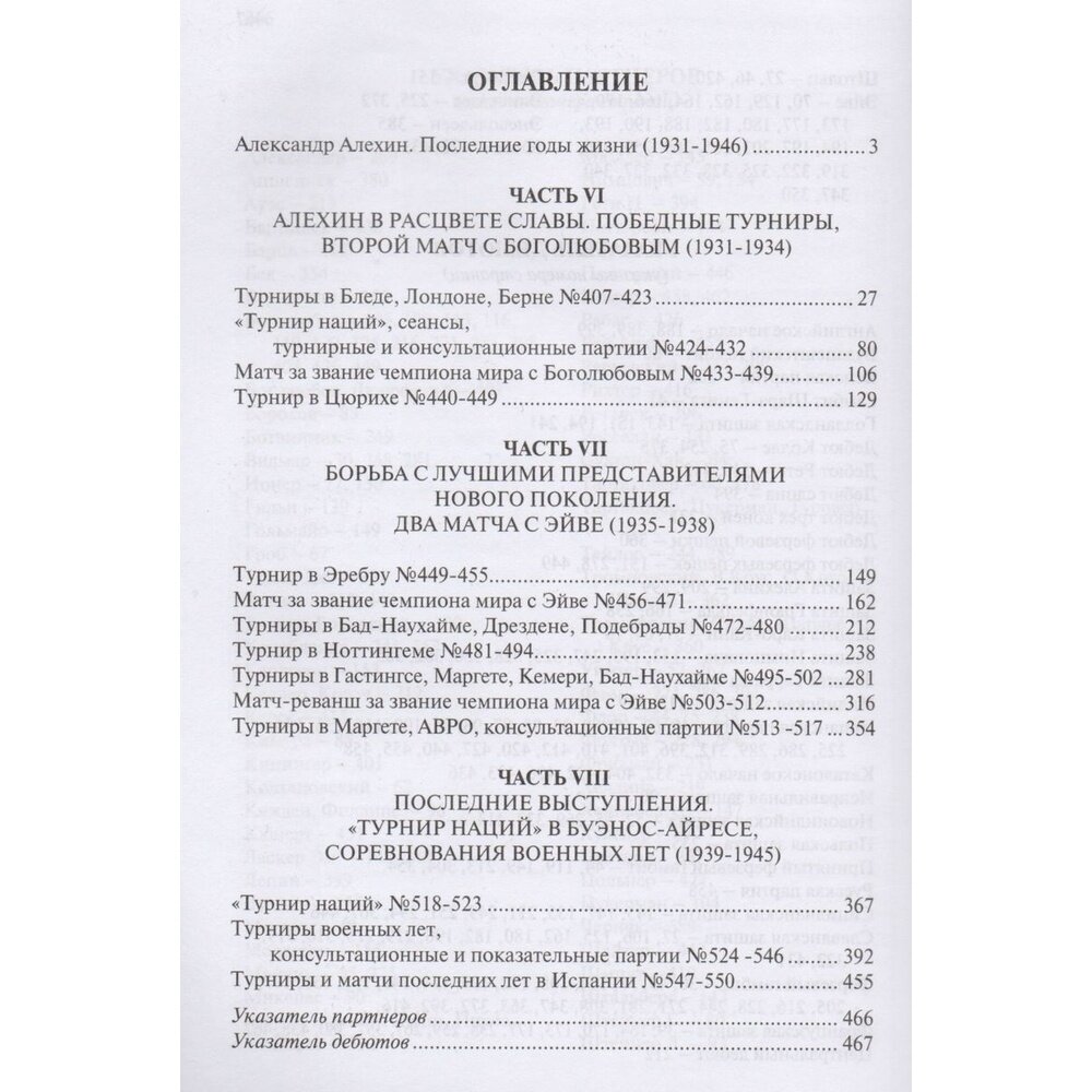 эта книга завершает полное собрание партий Александра Алехина .коротко и ёмко написана биография великого шахматиста ,причем приводятся факты ,о которых я слышу впервые ,радует и то что партии с комментариями чемпиона мира довольно подробными и конкретными -помогут как новичкам ,так и профессиональным шахматистам, для всех это настольный учебник книга прекрасно оформлена ,как и предыдущие,фотография соответствует времени и возрасту автора партии собраны в хронологическом порядке ,что очень удобно при работе с книгой.включены партии с экс -чемпионом мира Максом Эйве таккже содержит подробный анализ. да и цена на книгу хорошая