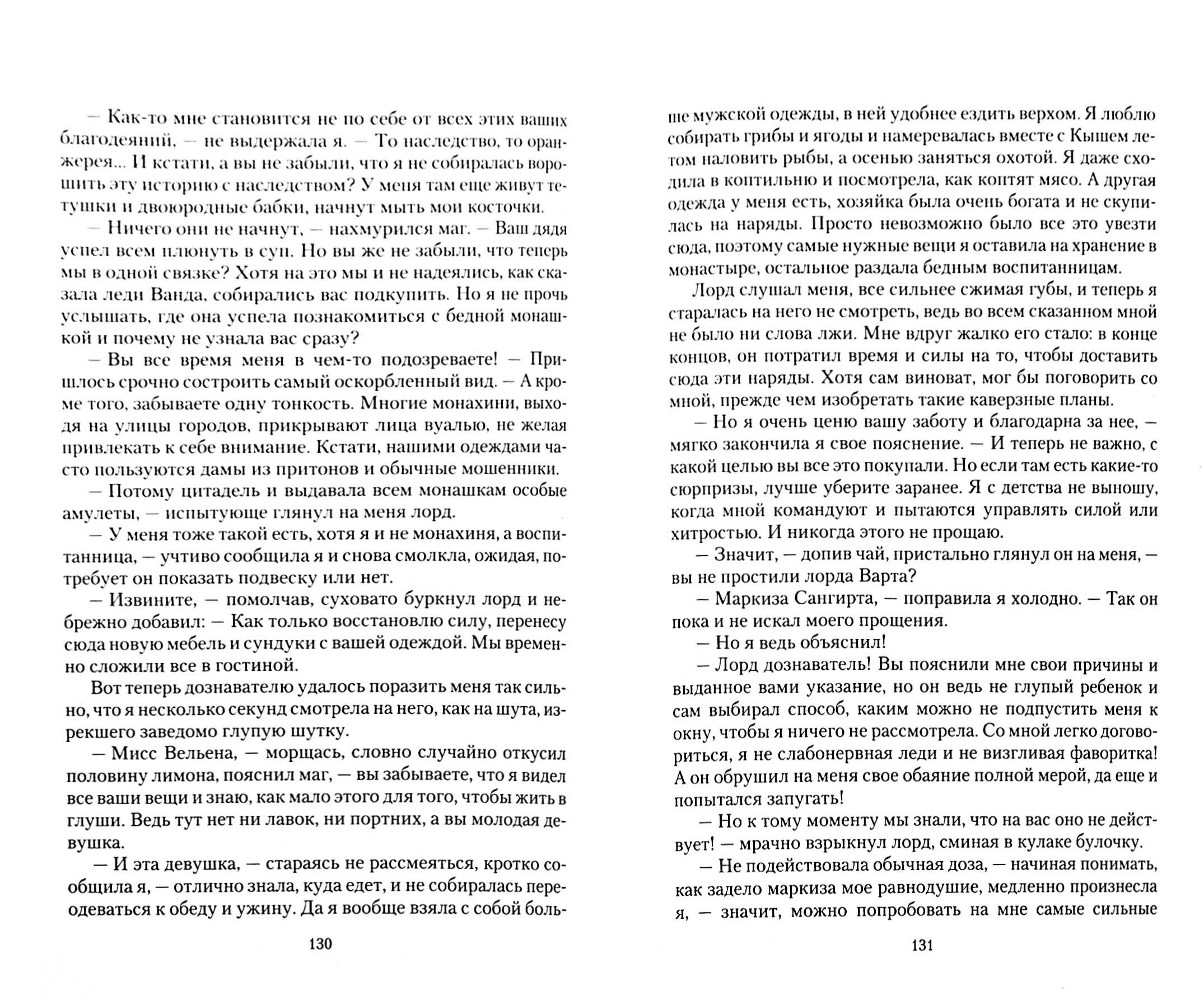 Развитие сюжета выстроено очень логично, хотя в один существенный момент я вот вообще не верю: погоня нашла Вельену уж очень подозрительно и невероятно – Кыш утром гулял всего ничего, а получается, что его успели призвать и он, чтобы вернуться, за это «ничего» промчался расстояние, которое ранее покрыл за 2-3 дня, и загнанным вовсе не выглядел. А ещё, какую бы личину придворный архивариус не носил, мне даже представить страшно, что подумает высший свет о молодой женщине, пусть и в статусе невесты живущей в доме одинокого мужчины, чтобы познакомиться с ним поближе и решить, выходить ли замуж, - не понимаю, что помешало подумать о компаньонке... хотя в этой части до представления в благородном обществе дело не дошло. Ну и умилил маркиз - так-то, получается, он всё ещё женатый человек, а рот на чужой каравай разевает, как будто свободен...