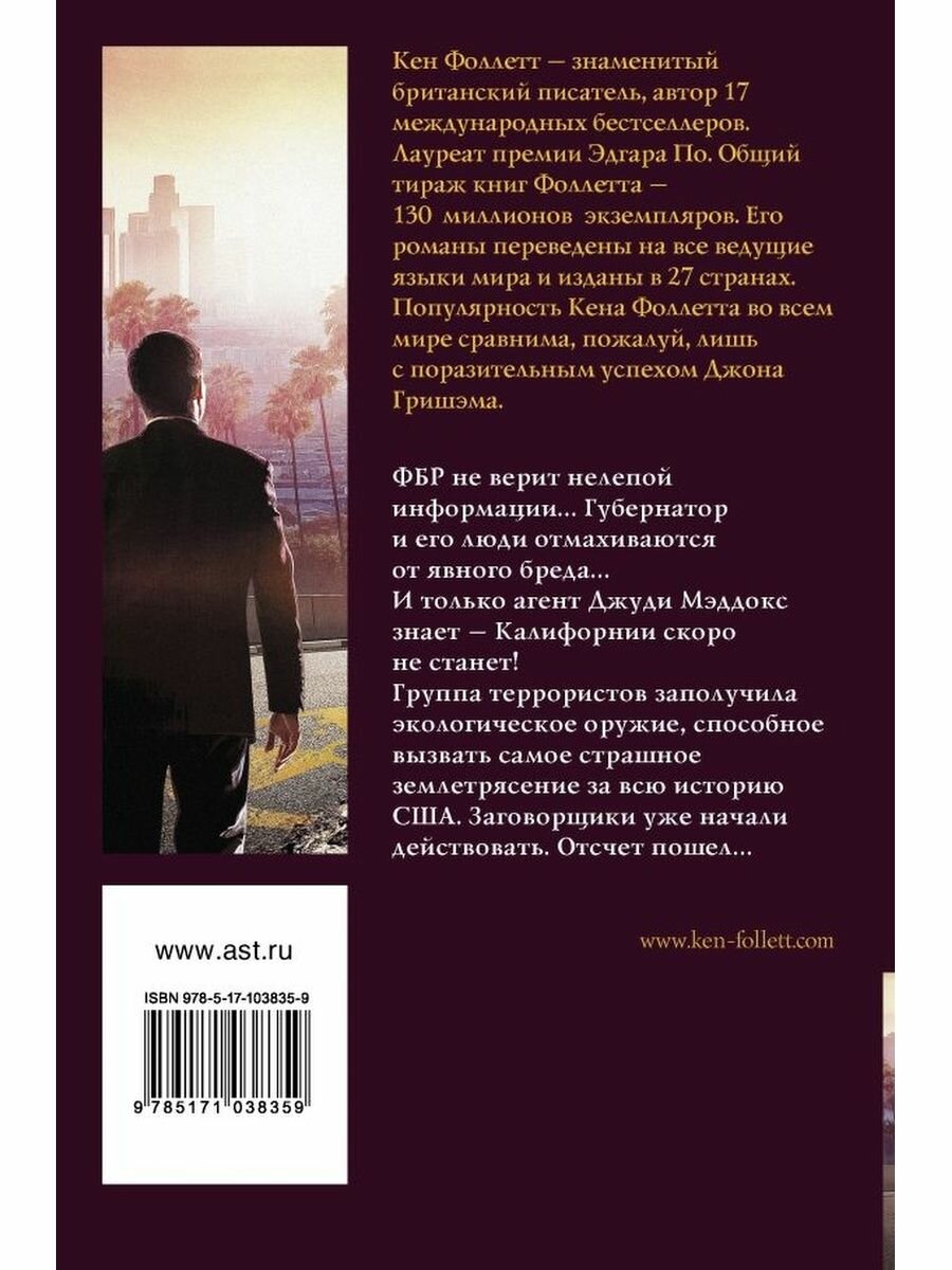 Совершенно неожиданный вид терроризма – использовать сейсмический вибратор, чтобы вызвать землетрясение. Фантазия Кена Фоллетта потрясающая, как и хорош язык, которым написана книга. Убийство, погоня, все, что присуще хорошему детективу, присутствует в книге. Читала с удовольствием. Очень рекомендую к прочтению.