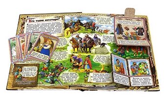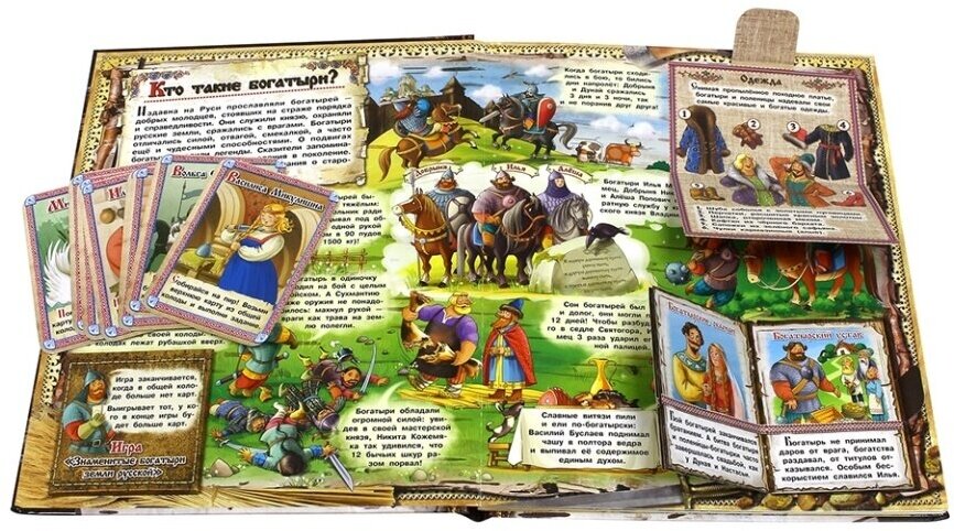 В целом, неплохая книга, хотя не могу сказать, что я от неё в восторге. Купила для 4-летнего сына, который заинтересовался богатырями. Ему книга понравилась. Для дошкольников подходит, а вот деткам постарше, думаю, будет уже не очень интересно. В книге пять разворотов с различными окошками, книжечками и карточной игрой. Былин или хотя бы коротких адаптированных историй о богатырях здесь нет. На карточках есть краткое описание каждого богатыря. В общем, содержание мне понравилось, идеально подходит для первого знакомства с богатырями, а вот качество издания оставляет желать лучшего, особенно с учетом цены. Картон тонкий. Подвижный элемент с богатырями на втором развороте вываливается. Долгого использования маленьким ребёнком книга не выдержит. За полную стоимость брать не рекомендую, а вот по какой-нибудь акции вполне можно купить.