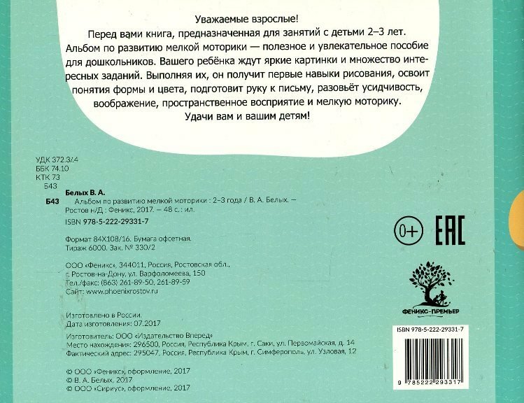 Альбом по развитию мелкой моторики. 2-3 года (Виктория Алексеевна Белых); Феникс, 2017
