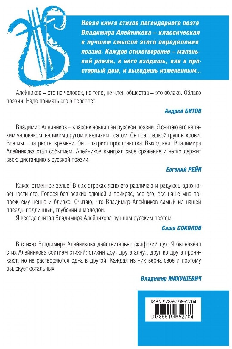 Новая книга стихов легендарного "смогиста" Владимира Алейникова - это классическая в лучшем смысле этого определения поэзия, в которой виртуозная рифма облекает не менее виртуозный смысл. Каждое стихотворение - маленький роман, в него входишь как в просторный дом и выходишь измененным...