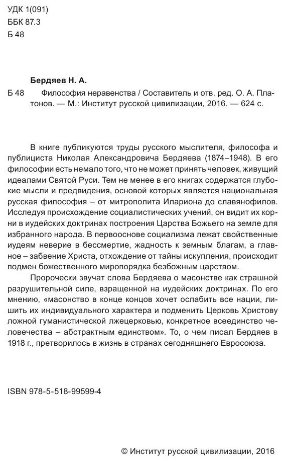 В книге публикуются труды русского мыслителя, философа и публициста Николая Александровича Бердяева (1874-1948). В его философии есть немало того, что не может принять человек, живущий идеалами Святой Руси. Тем не менее в его книгах содержатся глубокие мысли и предвидения, основой которых является национальная русская философия - от митрополита Илариона до славянофилов. Исследуя происхождение социалистических учений, он видит их корни в иудейских доктринах построения Царства Божьего на земле для избранного народа. В первооснове социализма лежат свойственные иудеям неверие в бессмертие, жадность к земным благам, а главное - забвение Христа, отхождение от тайны искупления, происходит подмен божественного миропорядка безбожным царством.