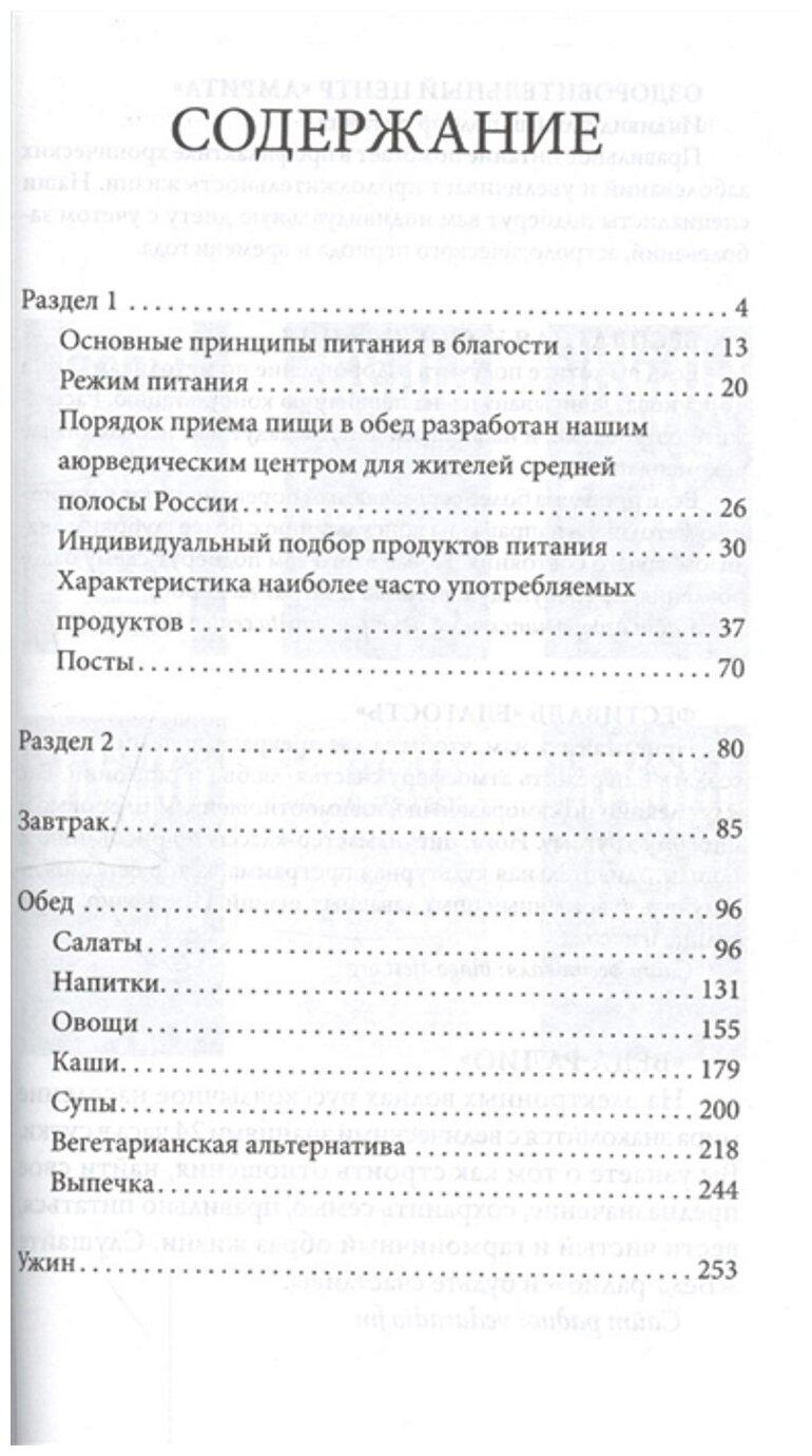 Книга состоит из нескольких разделов. Вначале рассказываются основные принципы питания по аюрведе, даётся характеристика разных продуктов и специй: какую роль они играют в нашей жизни, как именно влияют на наш организм, ум, настроение... В какое время можно есть те или иные продукты, а также как правильно поститься.