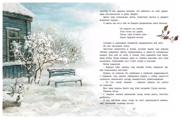 Бывают книги, от которых невозможно оторвать глаз. Здесь собрано все, мимо чего мы каждый день в спешке пробегаем, воспринимаем как должное, и даже не задерживаем взгляд. Времена года сменяют друг друга, колесо времени крутится, а летящие цветы сирени, осыпающиеся шишки, разноцветные желуди - от зеленого до шоколадно-коричневого, скачущие по ветвям неугомонные белки... способны задержать надолго и увлечь только ребенка. А жаль, можно сто лет прожить, но так и не увидеть, как цветет столетник. Да-да, тот самый столетник, знакомый каждому из нас лечебными листьями, оказывается, цветет шикарным огромным граммофоном благоухающих цветов. Об этом написал сказку Александр Куприн. Бедный цветок ежедневно подвергался унижениям со стороны других цветов, чьи соцветия уже раскрылись и радовали глаз своей нежностью. Особенно были красивы и надменны розы. Но так случилось, что и их красота померкла рядом с цветком столетника. Всего на пару часов. Потому, что цветок столетника появляется раз в сто лет и цветет всего несколько часов. Но многие ботаники мира готовы отдать за этот миг целые состояния.