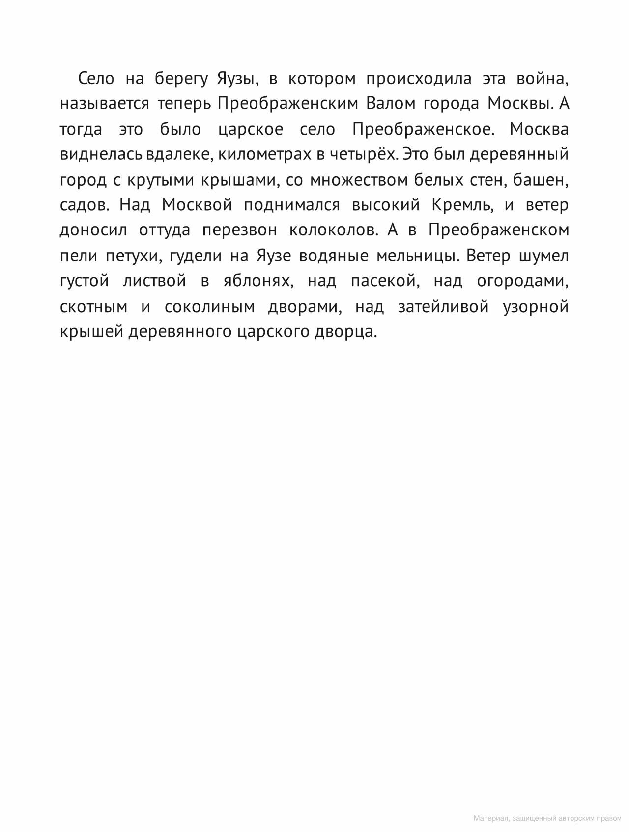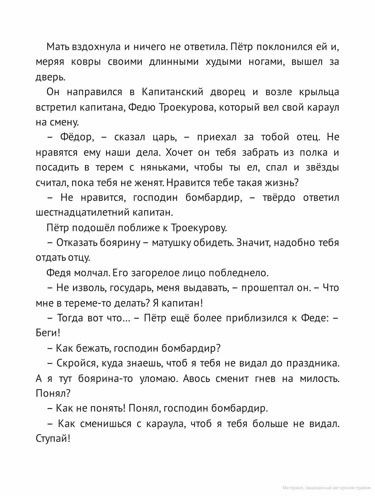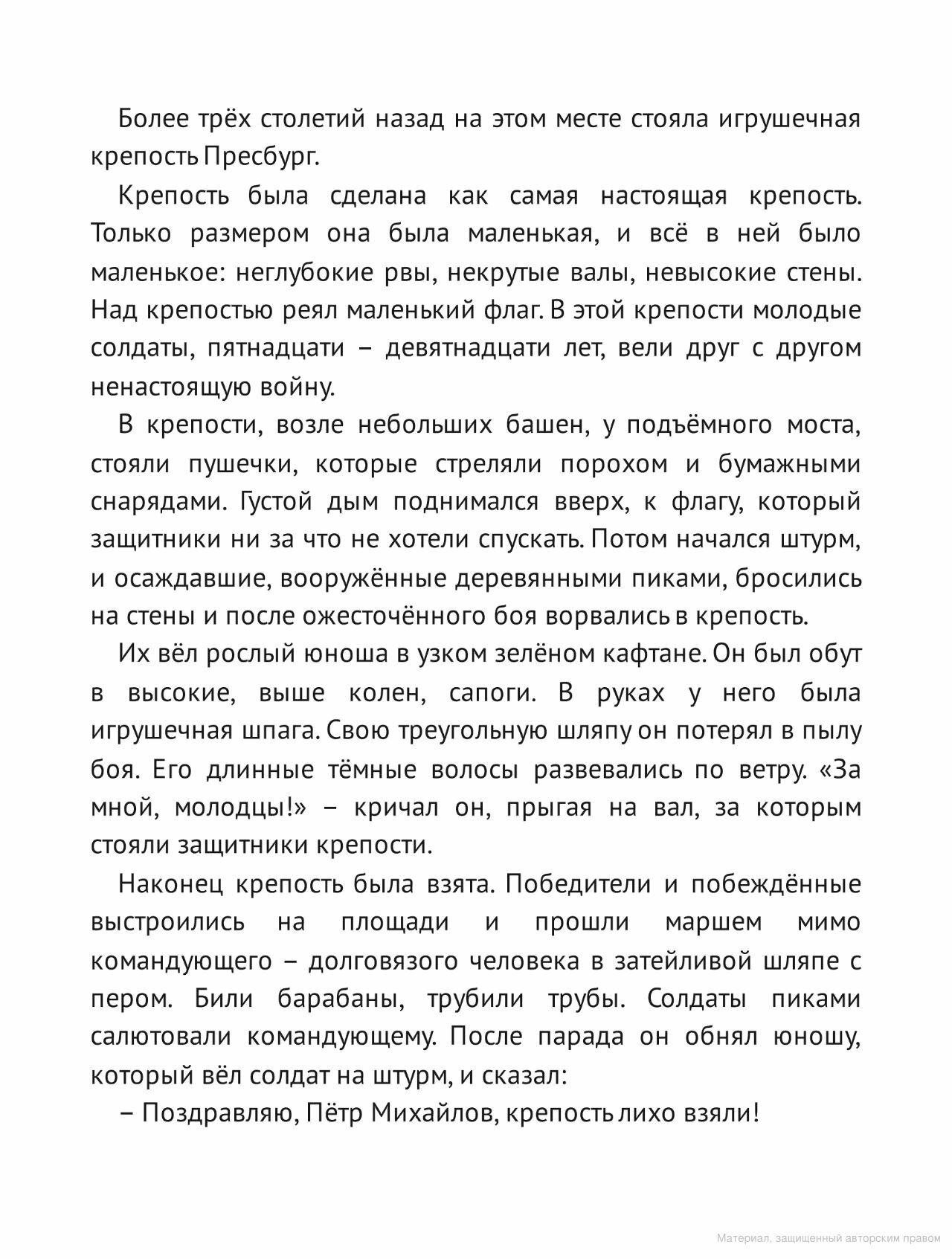 В повести "Дедушка русского флота" рассказывается о любознательном юноше, будущем царе и строителе военно-морского флота России Петре I, отыскавшем в "сухопутной" Москве старый ботик и впервые поплывшем на этой незатейливой лодочке по реке Яузе.