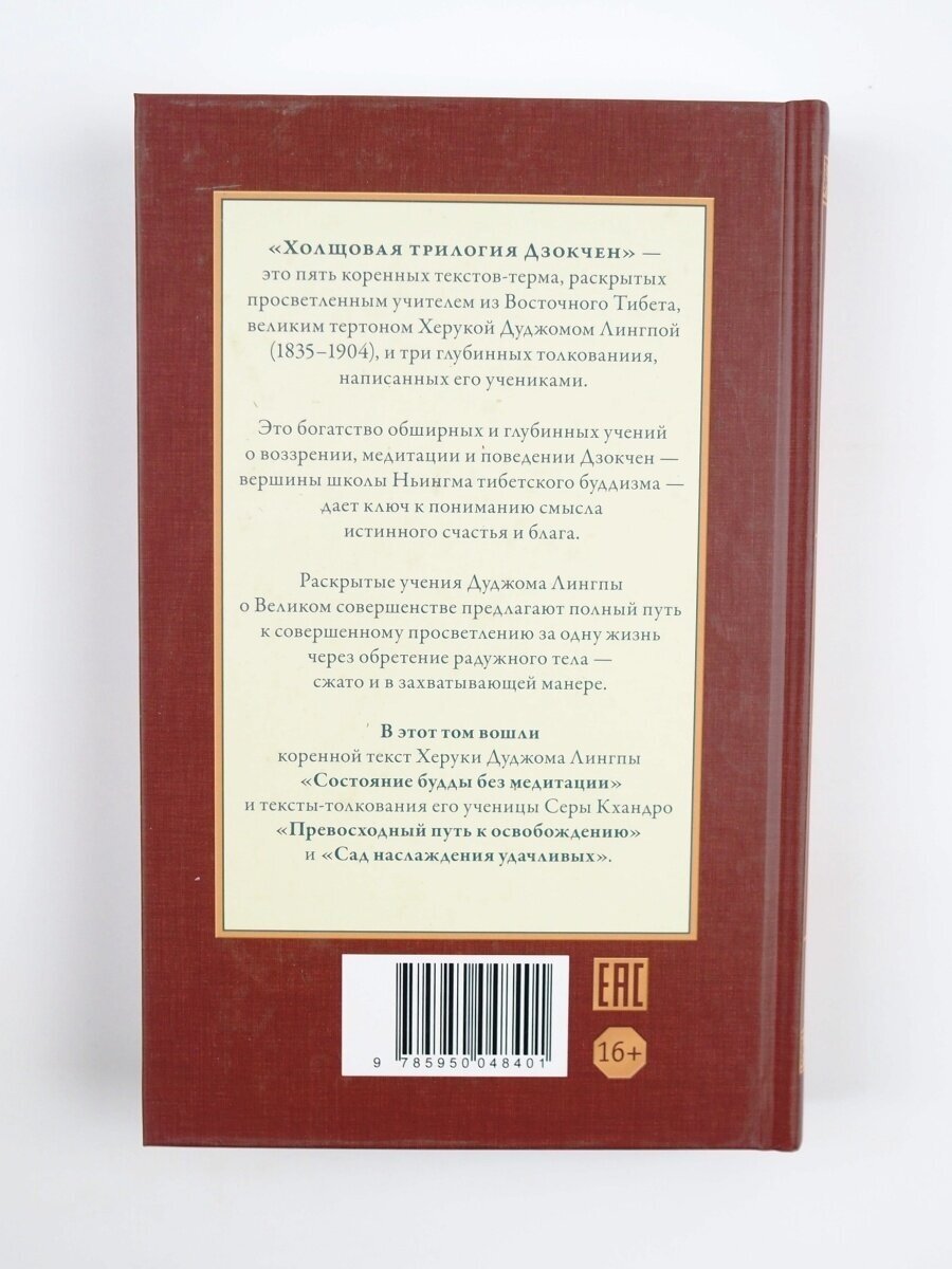 "Холщовая трилогия Дзокчен" - это пять коренных текстов-терма, раскрытых просветленным учителем из Восточного Тибета, великим тертоном Херукой Дуджомом Лингпой (1835-1904), и три глубинных толкованиия, написанных его учениками.