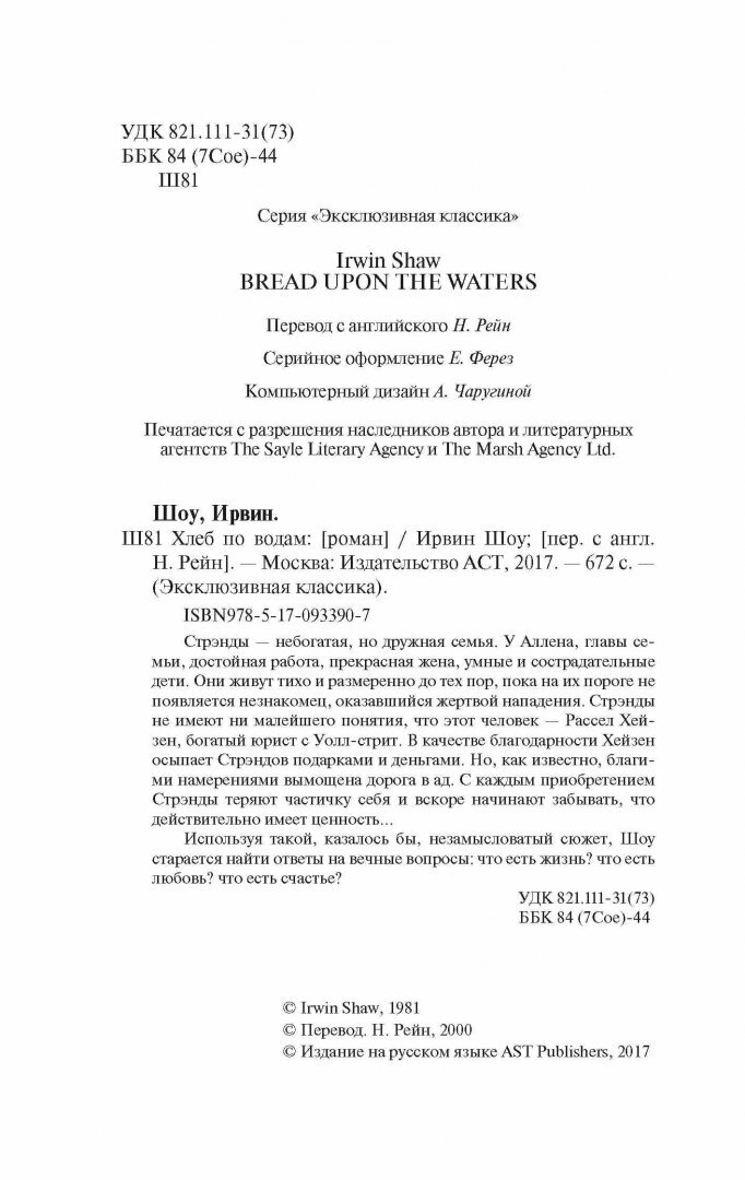 Книга: Хлеб по водам (Шоу Ирвин , Рейн Наталья Вениаминовна (переводчик)); АСТ, 2017