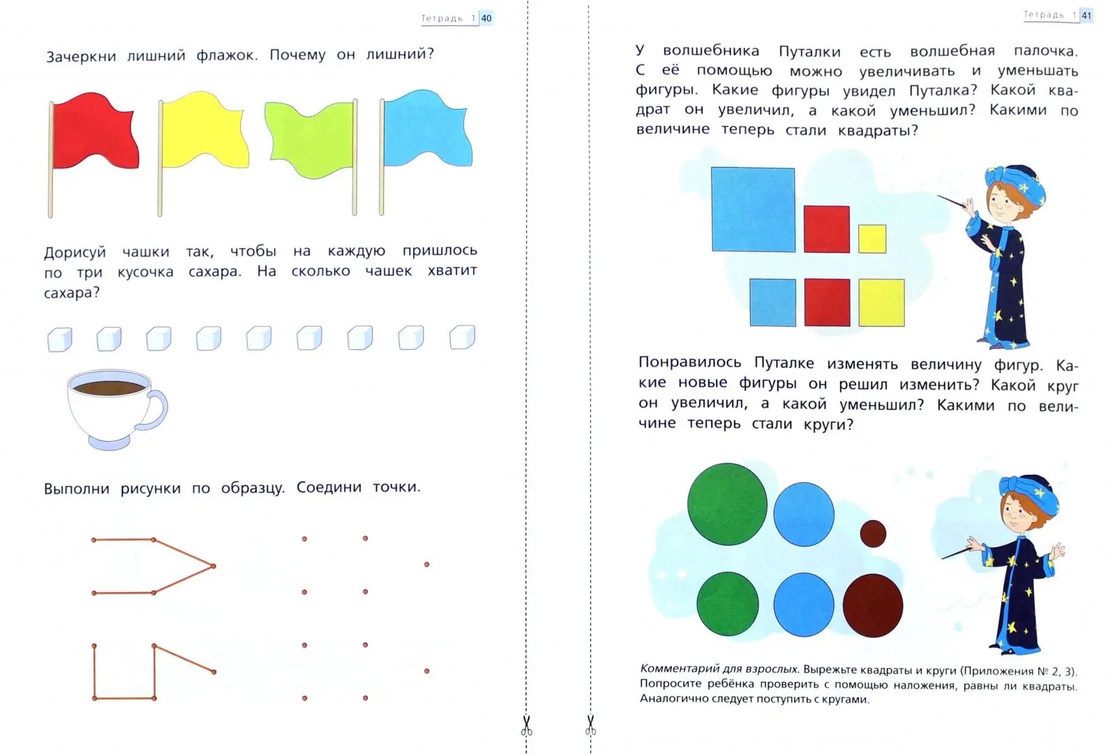 Книга очень понравилась своими нестандартными заданиями. Например: берём два одинаковых кусочка пластилина и из одного катаем колбаску, а потом спрашиваем ребёнка, какой кусочек пластилина больше? Недавно услышала от министра Васильевой, что дети 11 лет даже не могут ответить на этот вопрос. А эта книга рассчитана для детей 4 лет, так что судите сами, как эта книга поможет развить логическое мышление вашего ребёнка. Книга подойдёт родителям и воспитателям. Маленькая подсказка для воспитателей. Я написала на сайт ДРОФА и попросила у них методичку к занятиям, они прислали мне ссылку на бесплатное скачивание конспектов.