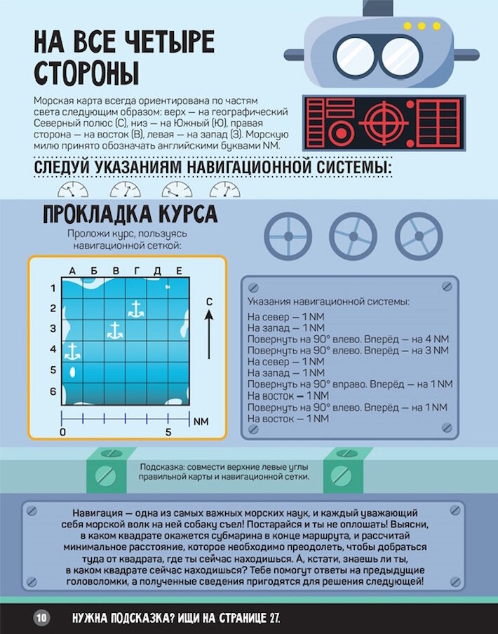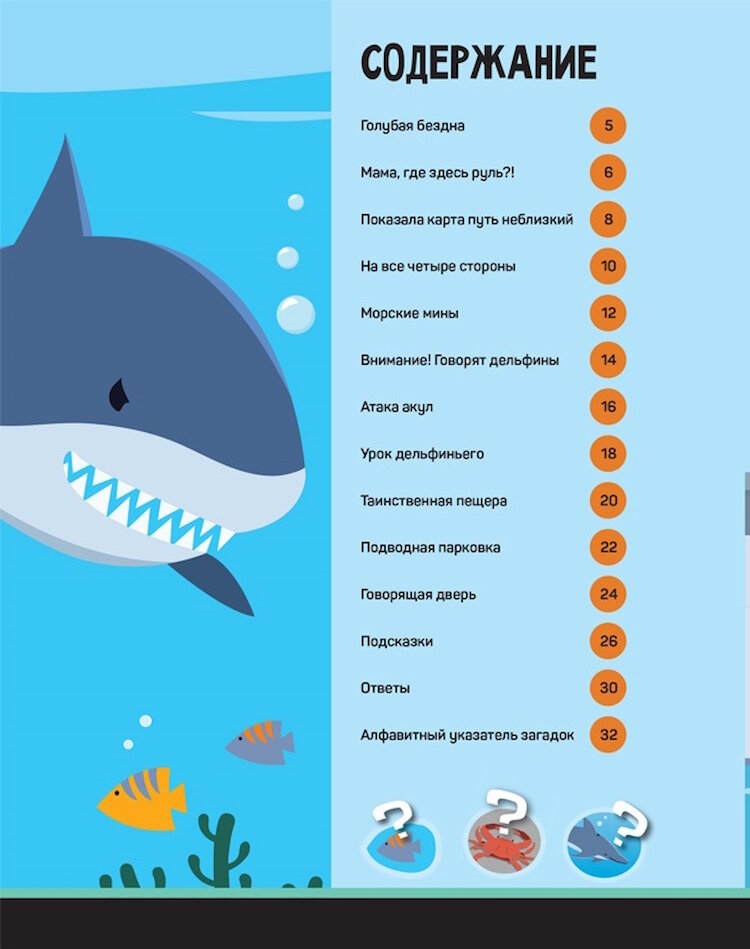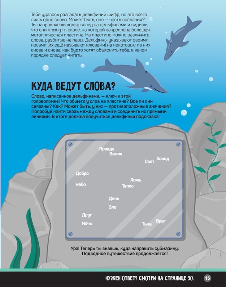 .атака акул, урок дельфиньего языка, прогулка по минному полю и секретная база подводных лодок! Чтобы решить самые каверзные задачки, поищи в книге намёки и подсказки. А на последних страницах есть даже готовые ответы (только не подглядывай, пусть всё будет по-честному)! Ну? Кто тут самый умный? Выходи играть!