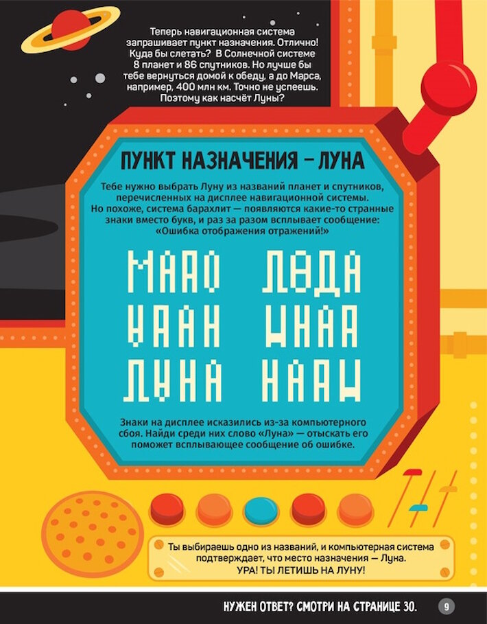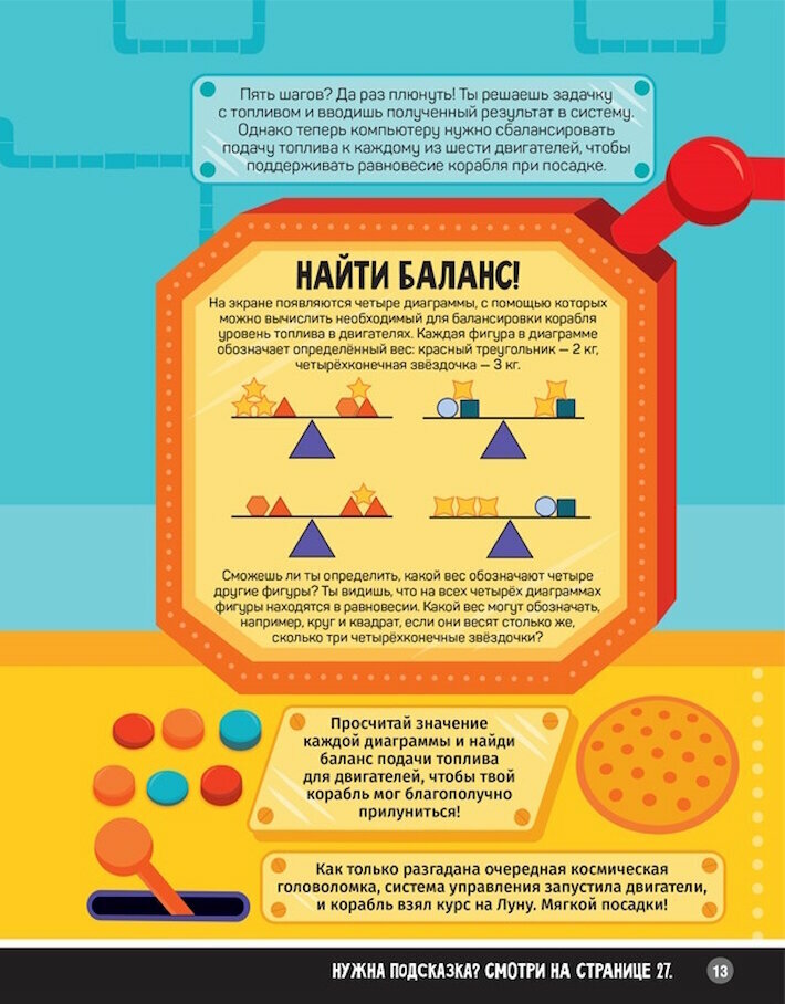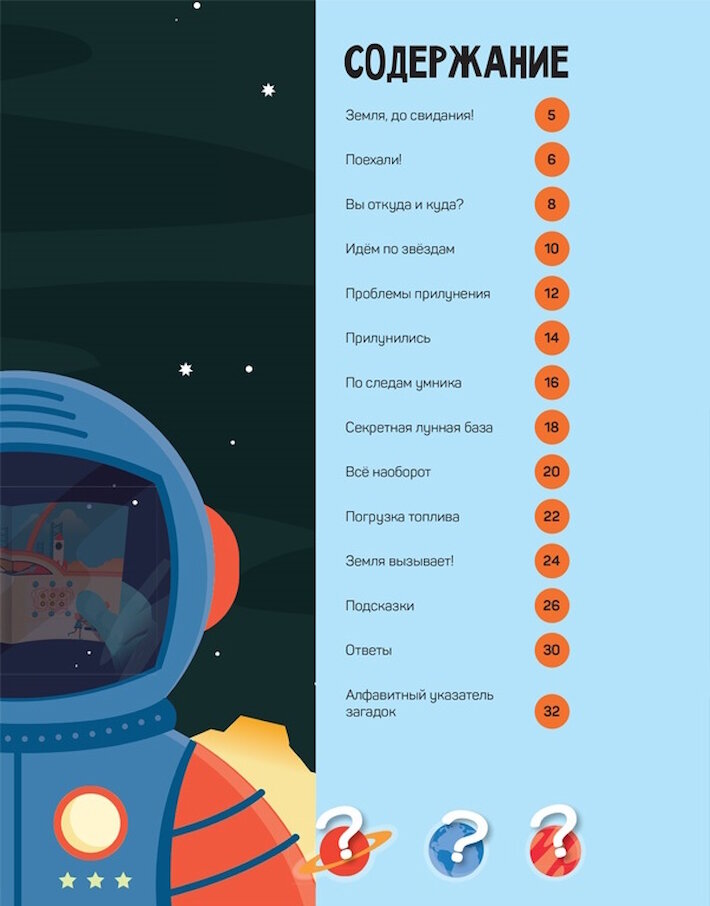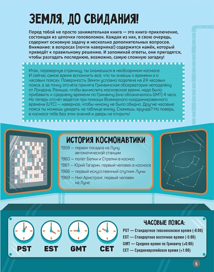 .…и ещё много чего интересного: искалки и находилки, укрощение роботов, цифровые шифры и целая гора интереснейшей математики - космонавту мало быть просто смелым, надо ещё и уметь кое-что! В корабле ты найдёшь подсказки, которые помогут решить самые каверзные задачки, а на последних страницах книги есть даже готовые ответы (только, чур, не подглядывать! А то испортишь всю игру). Так что - миссия выполнима. Ну? Кто тут самый умный? Выходи играть!