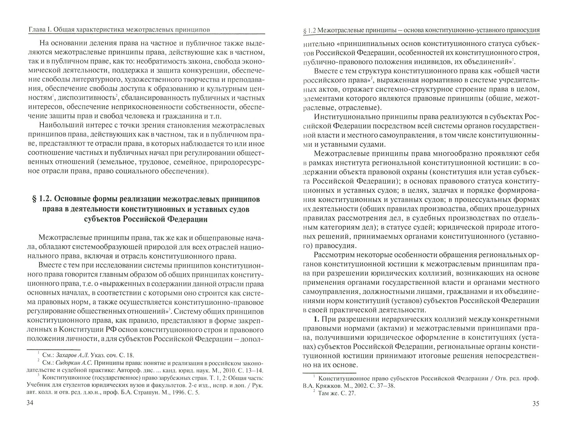 Монография посвящена рассмотрению основных вопросов теории и практики межотраслевых принципов права. В ней дается общая характеристика межотраслевых принципов права, а также проводится анализ основных форм их применения в деятельности конституционных и уставных судов субъектов Российской Федерации. Адресуется специалистам в области теории конституционного права и конституционного судебного процесса, отраслевых юридических наук, научным работникам, студентам, аспирантам и магистрантам.