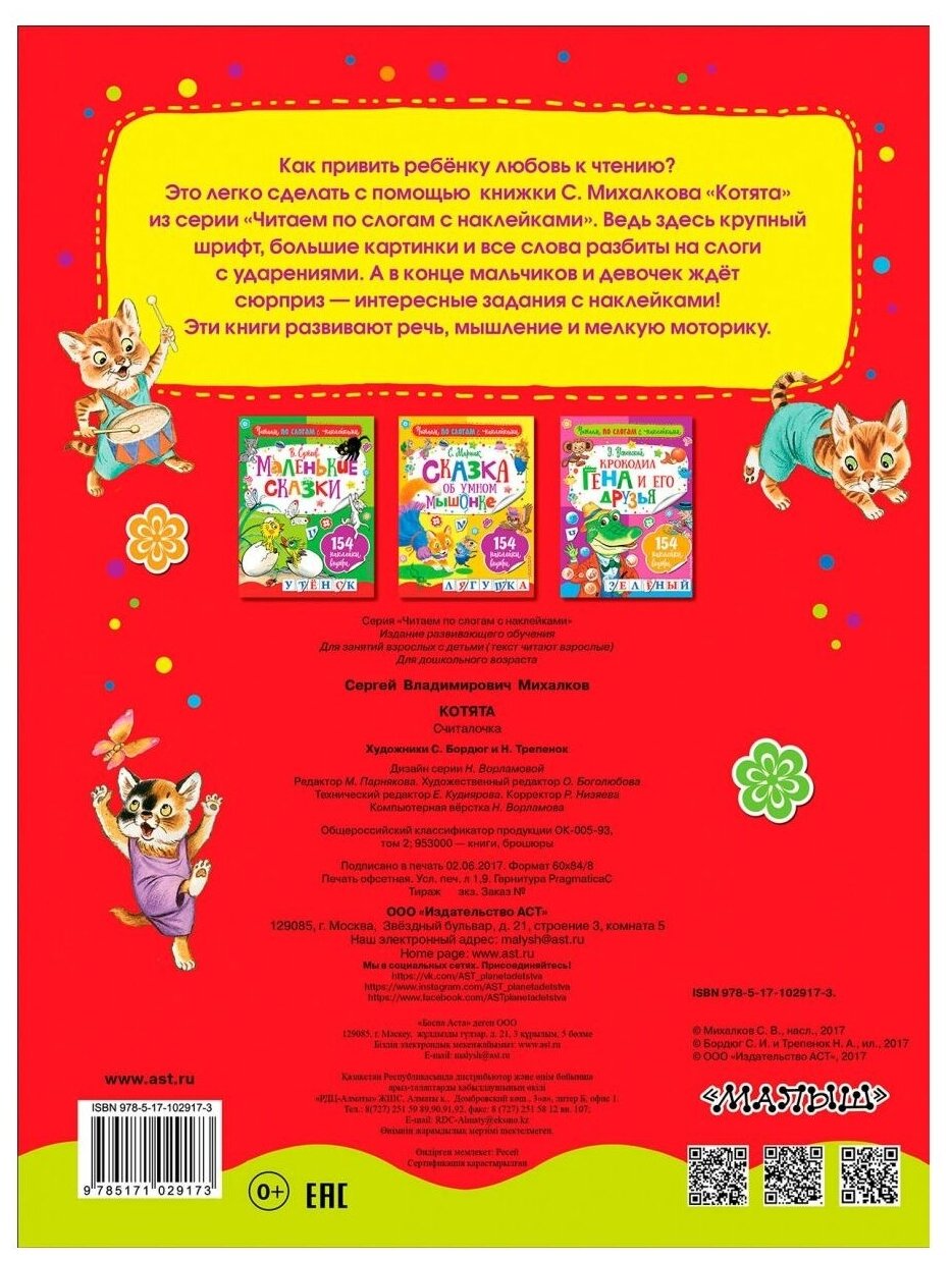 Как привить ребёнку любовь к чтению? Это легко сделать с помощью книжки С. Михалкова «Котята» из серии «Читаем по слогам с наклейками». Ведь здесь крупный шрифт, большие картинки и все слова разбиты на слоги с ударениями. А в конце мальчиков и девочек ждёт сюрприз — интересные задания с наклейками! Эти книги развивают речь, мышление и мелкую моторику.