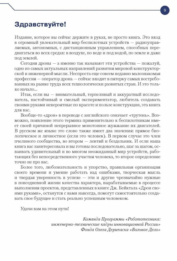 В данной книге с первой главы до последней автор последовательно учит читателя строить квадрокоптер. Начинается процесс обучения с постройки рамы, далее автор показывает как на раму установить двигатели и пропеллеры, потом объясняет как дополнить квадрокоптер управляющей электроникой, после этого он рассматривает, как обеспечить квадрокоптер электропитанием и установить дополнительное оборудование ( видеокамеру, курсовую камеру, посадочное шасси, парашют, защитную площадку или купол, защиту пропеллера). В конце книги Джон Бейктал даёт краткий обзор программного обеспечения для квадрокоптеров и рекомендации по конфигурированию полётного контроллера, а также ссылки для проверки управляющего скетча и порядок действий перед запуском квадрокоптера. Наряду со строительством квадрокоптера, даются подробные пошаговые иллюстрированные инструкции по созданию, программированию и тестированию дрона-ракеты, дрона-аэростата, плавучего дрона и дрона-вездехода.