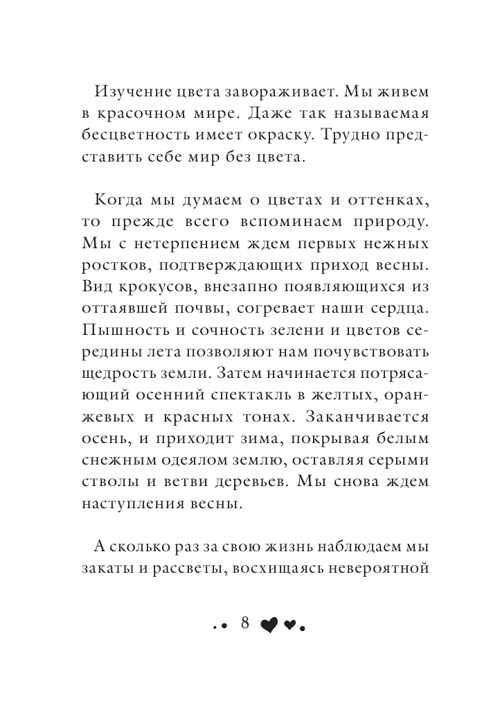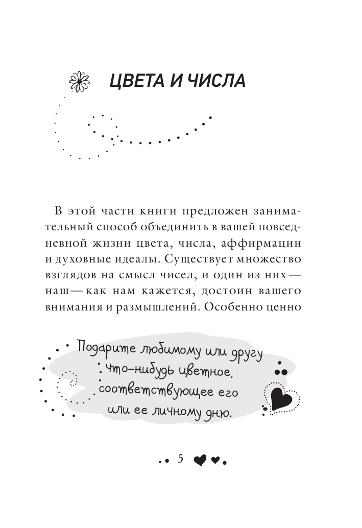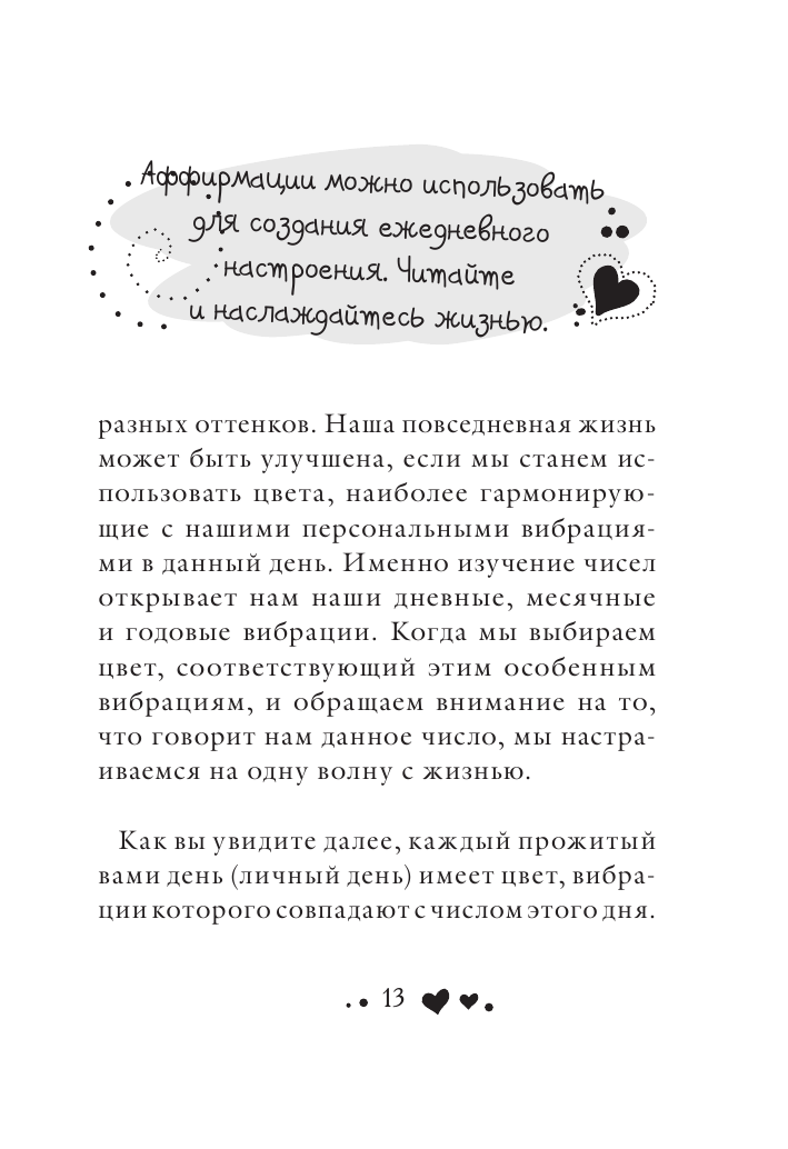 Кроме позитивных аффирмаций на каждый день и на все случаи жизни, в этой книге вы найдете уникальную теорию Луизы Хей, посвященную цветам и числам, их роли в нашей повседневной жизни. И не только теорию - с помощью специальных таблиц и методик вы сможете рассчитать свой личный год, месяц и день и узнать, как их применять для достижения успеха. А еще вы окунетесь с головой в мир красок и научитесь использовать цвета во благо себе и окружающим.