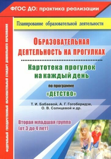 В пособии представлена система прогулок во второй младшей группе (от 3 до 4 лет), разработанная на основе положений ФГОС ДО, комплексной образовательной программы дошкольного образования "Детство" Т. И. Бабаевой, А. Г. Гогоберидзе, О. В. Солнцевой и др. (СПб.: ООО "Издательство "Детство-Пресс""). В картах каждой прогулки сформулированы педагогические цели, определены планируемые результаты - целевые ориентиры образования; раскрыта деятельность детей в таких видах, как игровая, коммуникативная, познавательно-исследовательская, самообслуживание и элементарный бытовой труд, двигательная; предложен набор средств, позволяющий педагогам развивать познавательные, речевые и практические умения у младших дошкольников в процессе ознакомления с объектами и явлениями природы, формировать первичные представления о себе и других людях. Предназначено воспитателям и руководителям ДОО, специалистам дошкольной педагогики; рекомендовано студентам высших и средних педагогических учебных заведений, родителям.