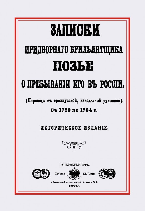 Репринт с изданий Спб. Эти воспоминания не выходили в виде отдельной книге, а печатались только в журнале Русская Старина. Жереми Позье (1716 Женева - 1776 Женкева) гугенот. В 1729 году Жереми Позье вместе с отцом Этьеном прибыл в Россию по приглашению своего дяди, служившего хирургом при дворе Петра II Отец и сын путешествовали в Санкт Петербург пешком через Швейцарию, Германию и Голландию. После краткосрочной службы в армии под Архангельском (1730-1731) и смерти отца, молодой Жереми Позье получил пост подручного в мастерской французского граверовщика камней Бенуа Граверо, где он проучился семь лет (1732-39). Молодой ученик превзошел мастерством своего учителя, и скоро привлек внимание императрицы Анны Иоанновны, под покровительством которой в 1740 Жереми Позье открыл свою собственную мастерскую. Открыв собственное дело, Позье, получивший титул Главного Бриллиантого Мастера и Придворного Ювелира, создавал ювелирные украшения и подарки для Российской аристократии, придворных и Императорской фамилии. Позье получил известность как выдающийся мастер ювелирного искусства, обладающий тонким вкусом, благодаря чему ему было доверено создать Большую Императорскую Корону для коронации Императрицы Екатерины Великой в 1762 году.