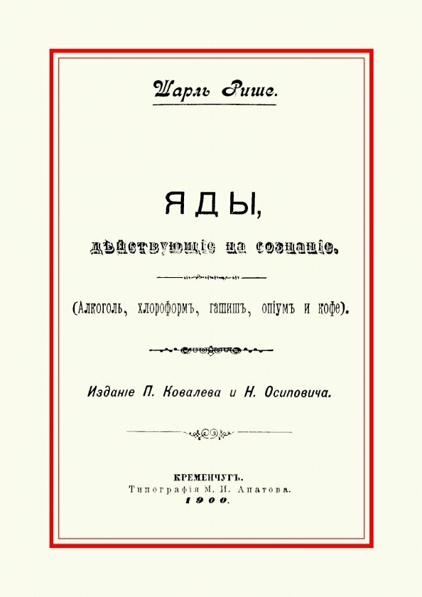 Репринт с издания. Издание П. Ковалева и Н. Осиповича, Типография М.И. Апатова (Кременчуг) 1900.Научно-популярный очерк о влиянии алкоголя, хлороформа, гашиша, опиума и кофе на умственные способности. Шарль Робер Рише (фр. Charles Robert Richet; 1850 - 1935) - французский физиолог, пионер во многих областях исследований, таких как нейрохимия, пищеварение, терморегуляция у гомойотермных животных и дыхание. Лауреат Нобелевской премии по физиологии и медицине в 1913 году.