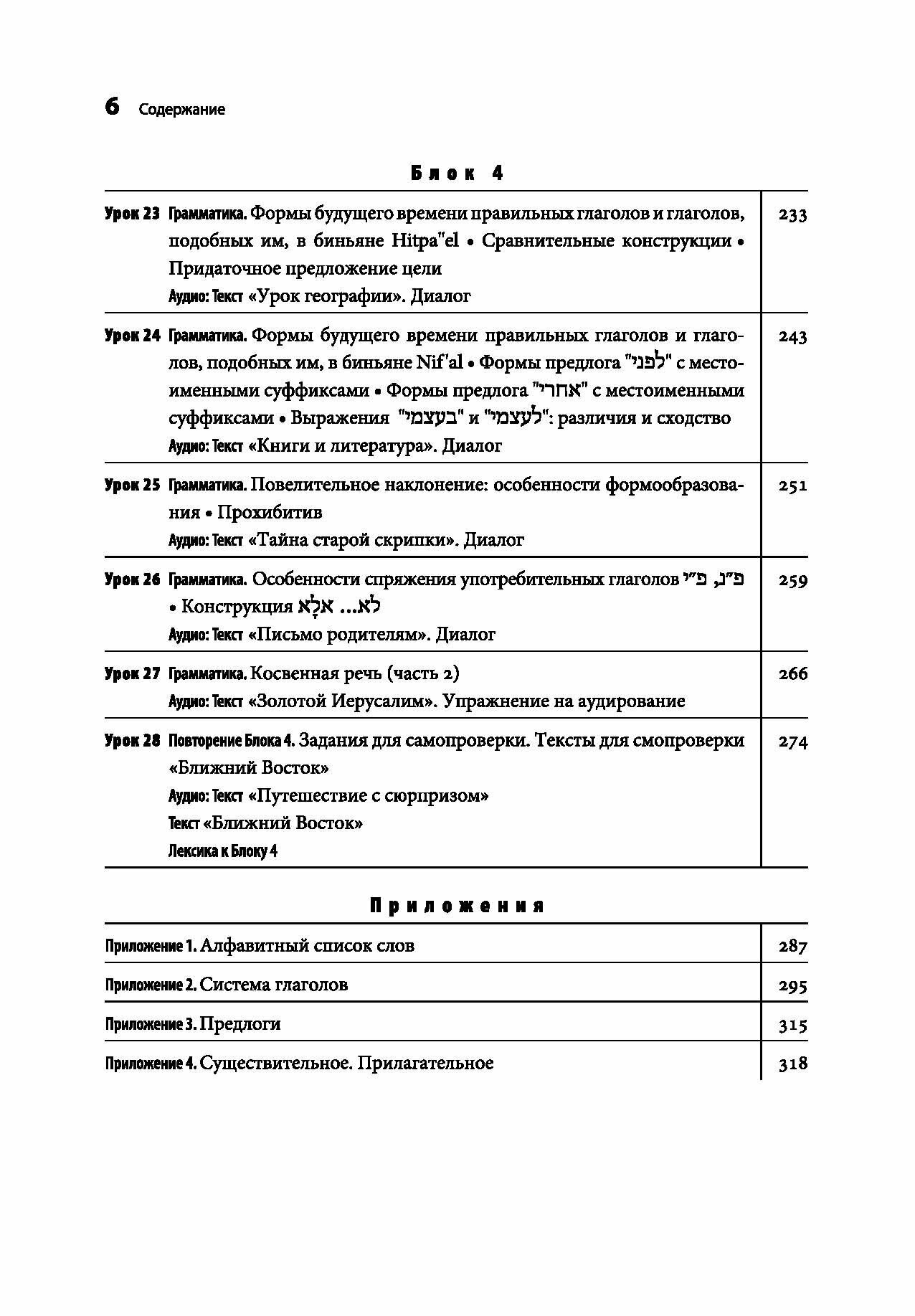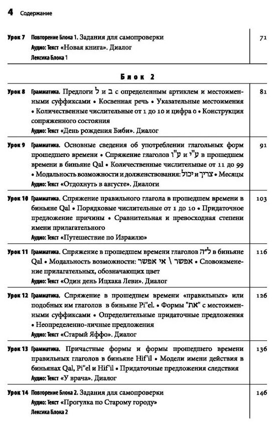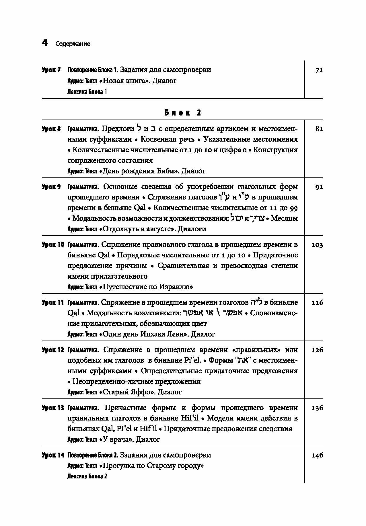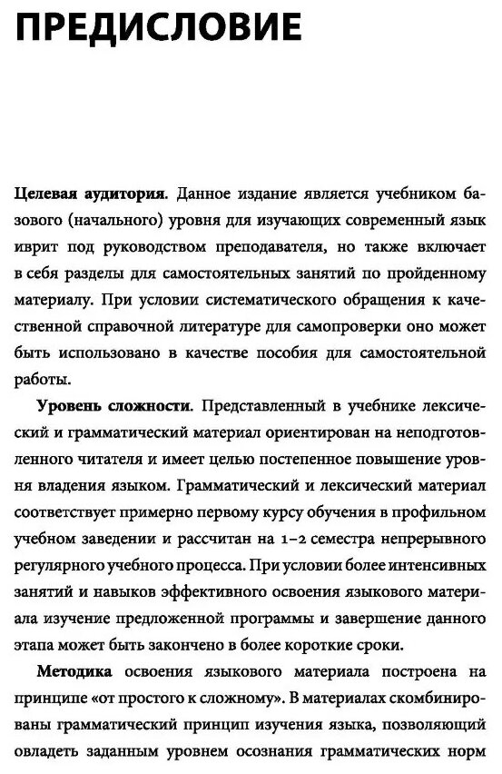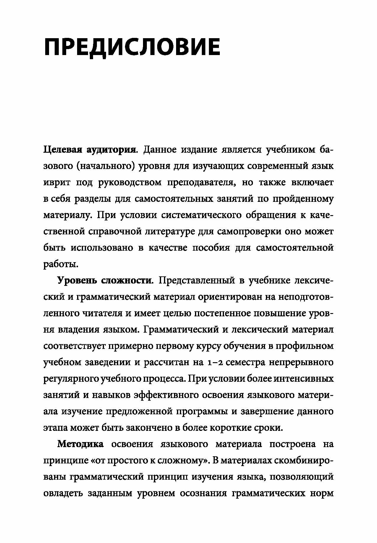 Учебник, как пишет автор, он для занятия с преподавателем или с доп. справочной литературой. Там, например, нет перевода используемой лексики (почти), то есть нужен словарь. Зато отличные таблицы с глаголами, предлогами и т.д. Тексты неплохие, упражнений много. Грамматика здесь интенсивная (примерно а1 и а2 охвачены). Объясняется все хорошо, понятно и просто. Лексического материала здесь достаточно, чтобы изъясняться на базовом уровне. Но нужно учитывать, что учебник в первую очередь писался для университета, где преподавание происходит по-другому, хотя, конечно, там нет ничего, что не могло пригодиться. Я занималась по нему, чтобы повторить грамматику. На мой взгляд этот учебник подойдет не для тех, кто хочет учить самостоятельно иврит, а для тех, кто хочет повторить пройденное или занимается по нему с кем-то. Однако есть учебники и получше, например, иврит мин хатхала