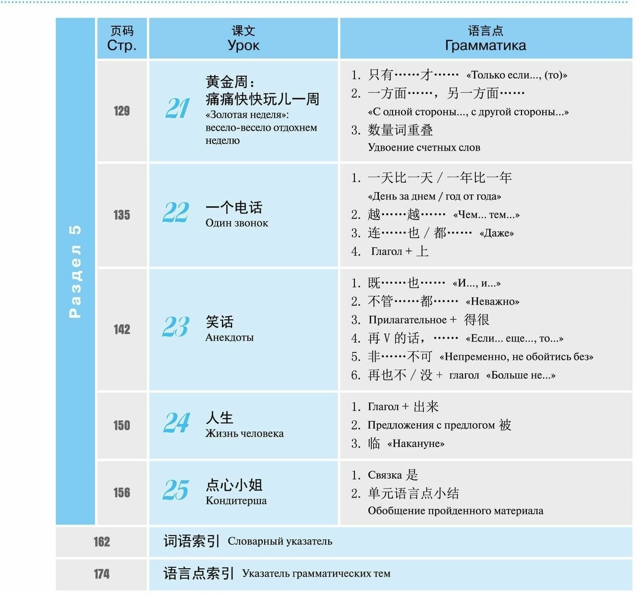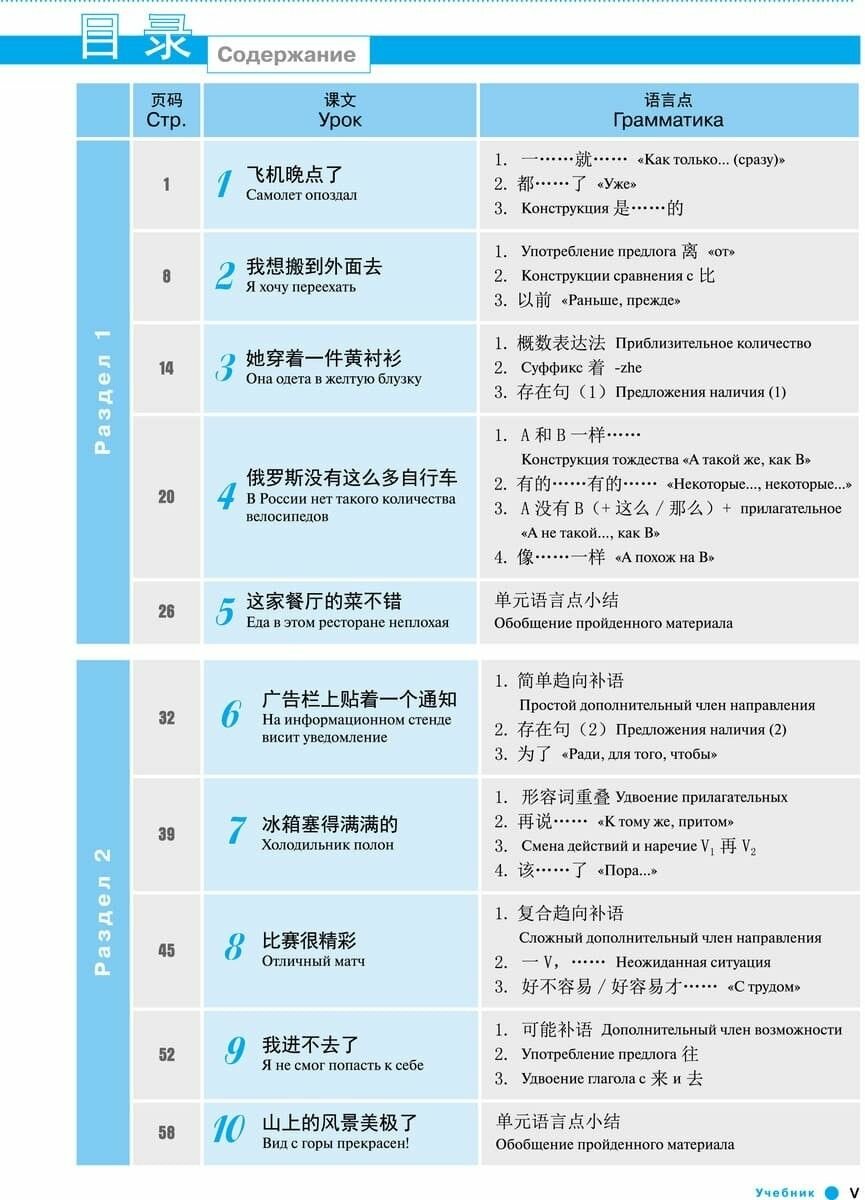 Основная часть учебника состоит из двадцати пяти уроков. Каждый урок включает в себя новые слова и выражения, необходимые грамматические комментарии, диалоги, тексты и разнообразные упражнения: на запоминание и написание основных иероглифов, на подстановку слов и на исправление намеренно сделанных ошибок, на самостоятельную композицию фраз. Каждый блок из пяти уроков завершается обобщающим уроком для повторения и контроля изученного.