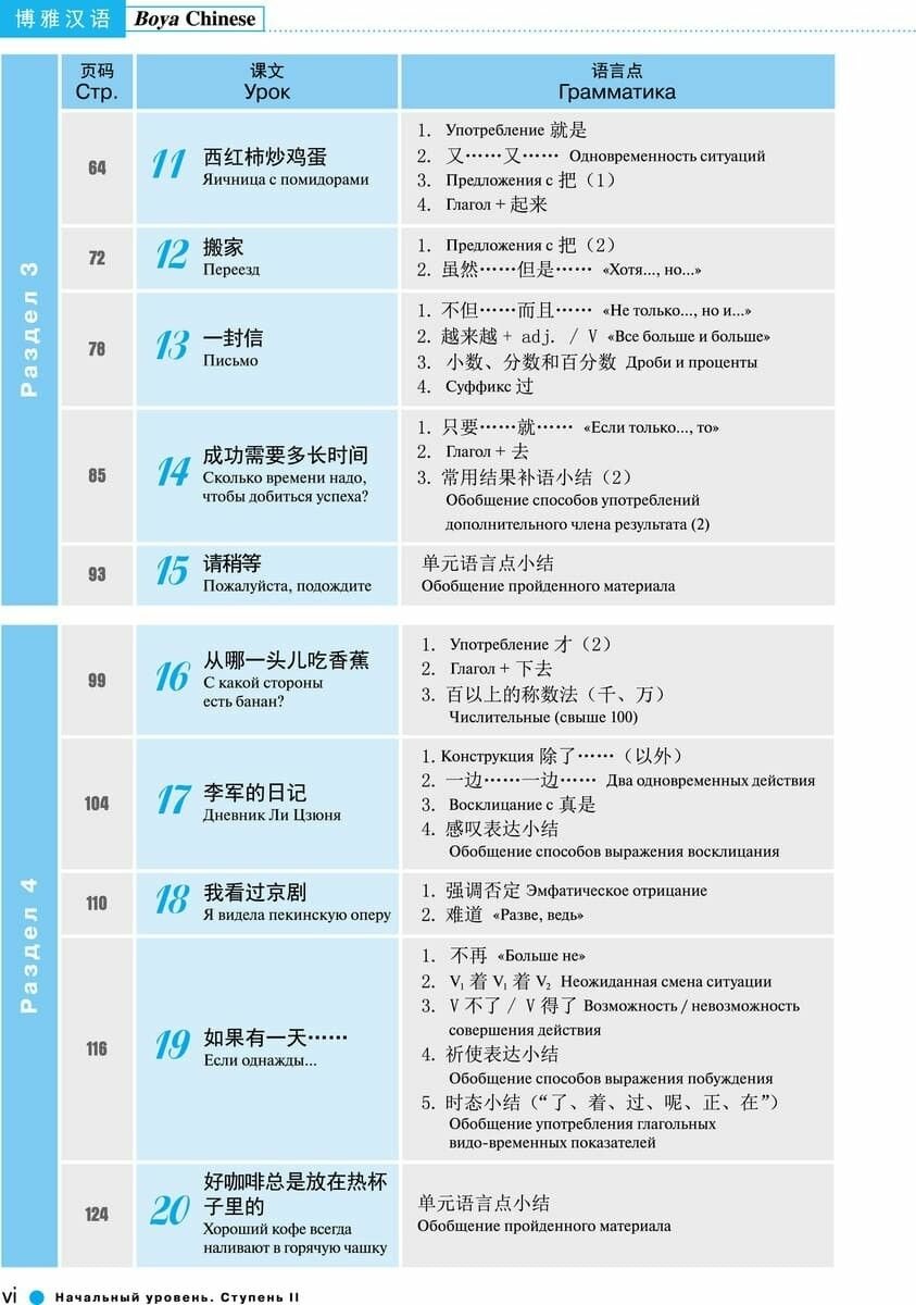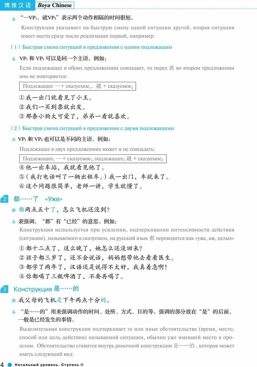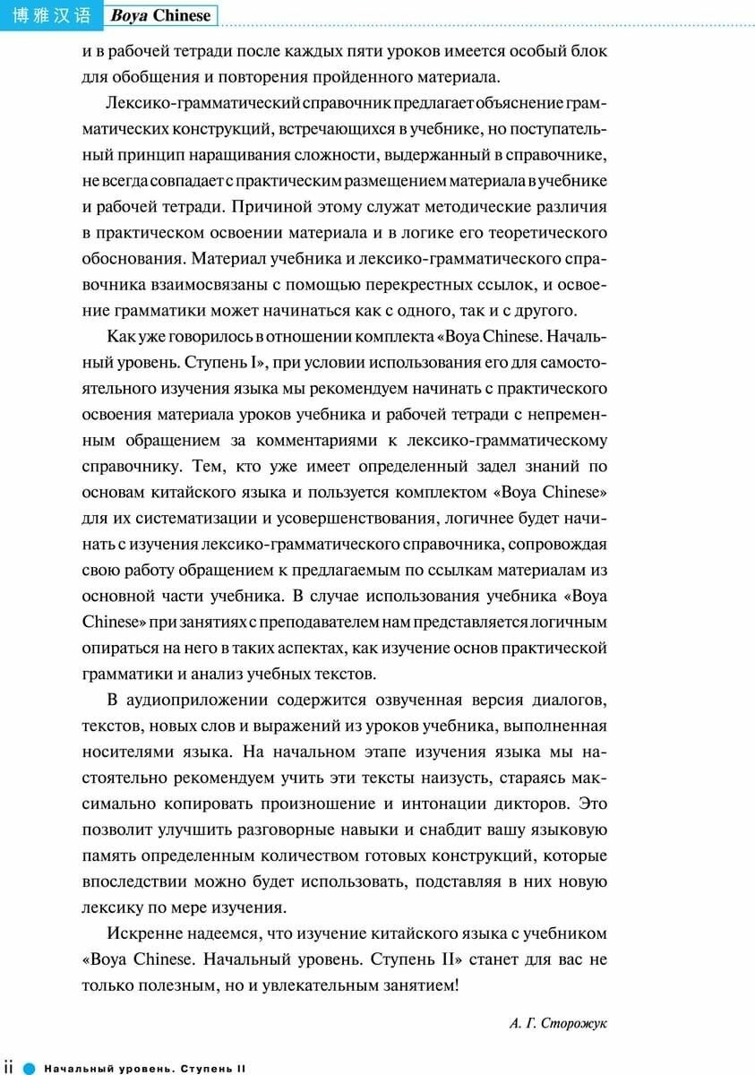 Учебный комплект "Boya Chinese. Начальный уровень. Ступень II" состоит из трех книг - учебника, рабочей тетради и лексико-грамматического справочника. Комплект охватывает примерно 800 лексических единиц.