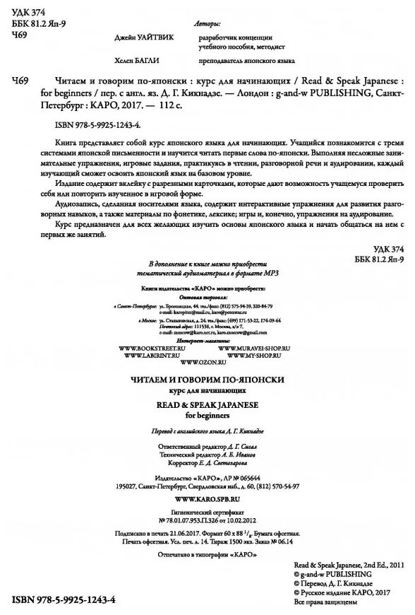 Читаем и говорим по-японски. Курс для начинающих (Кикнадзе Д.Г. (переводчик), Багли Хелен (соавтор), Уайтвик Джейн); КАРО, 2017