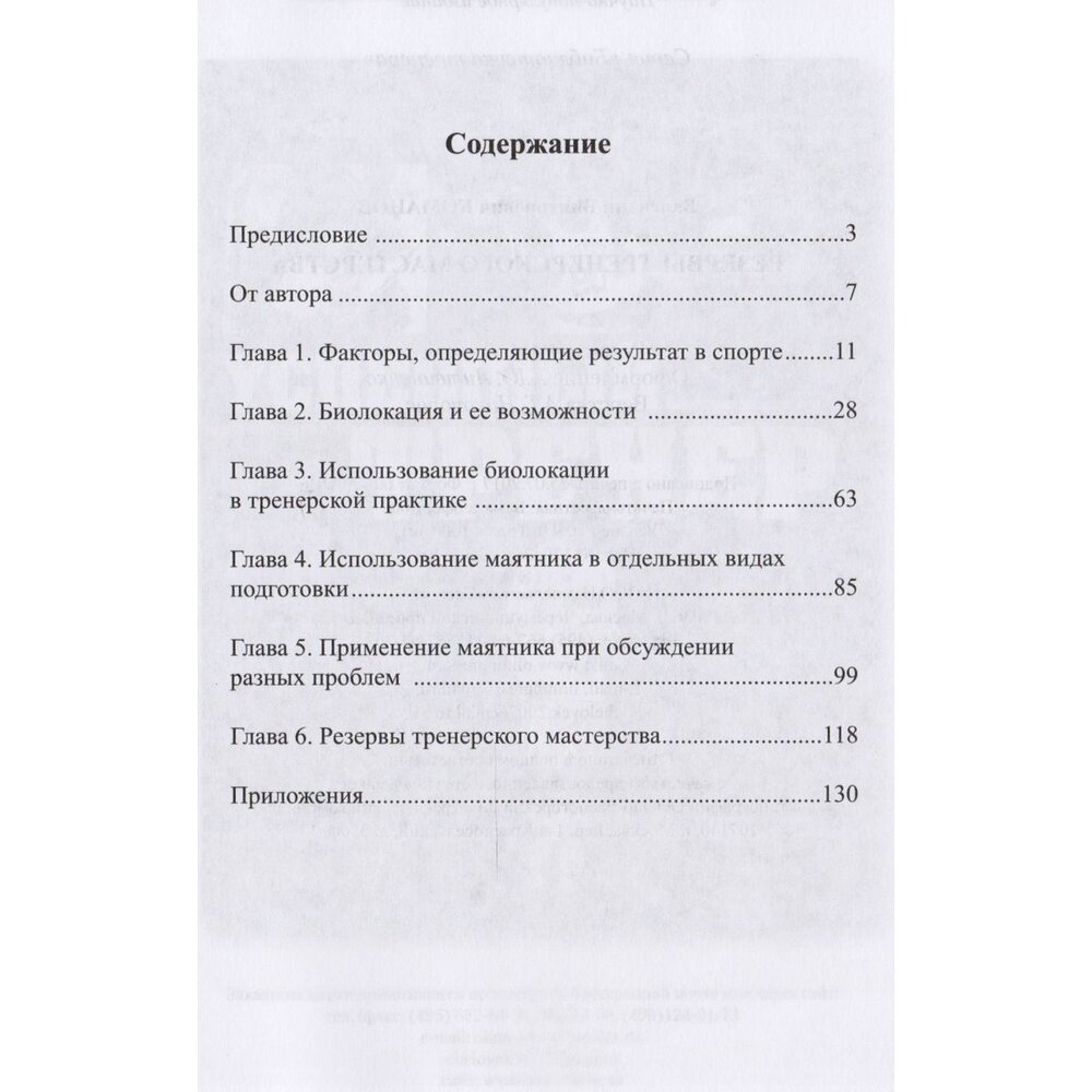 Эта книга – необычный и увлекательный эксперимент. Впервые предпринята попытка применить древнюю практику – биолокацию – для создания оригинальной методики в тренерской деятельности. Предлагается с ее помощью более эффективно решать многие задачи тренировочного процесса: это и проблемы отбора, и задачи планирования, и осуществление комплексного контроля, и ряд других важных функций в работе тренера. Представленная методика весьма универсальна – она одинаково удобна для любого вида.