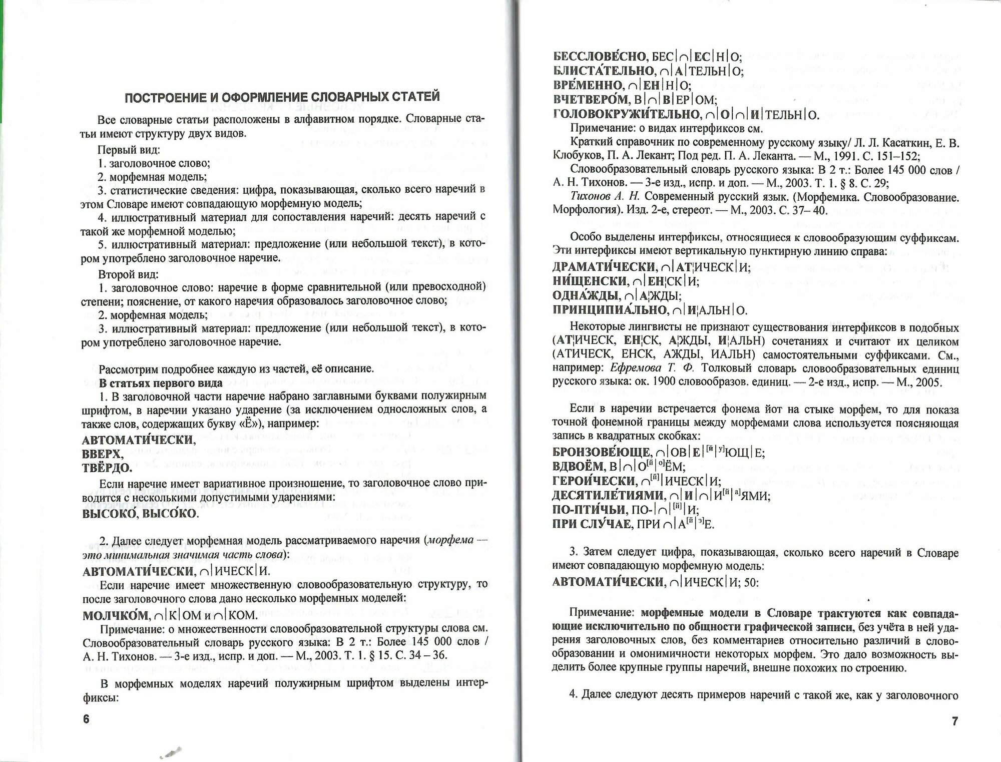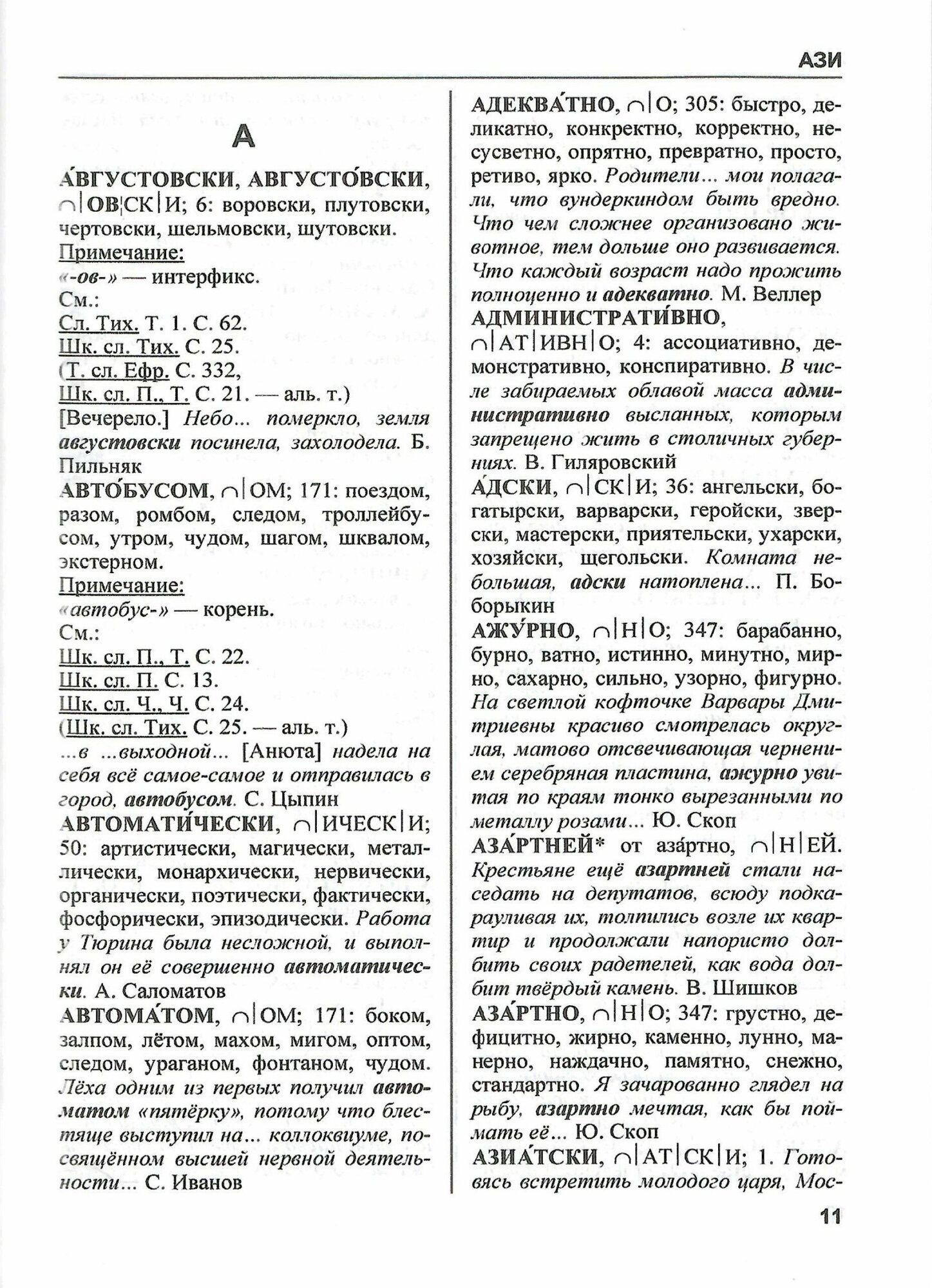 Если просто раскрыть на первой попавшейся странице, реакцией будет удивление: что за чушь? Но это тот случай, когда стоит потратить несколько минут на изучение информации о построении и оформлении статей в издании. Вкратце: слово, его разбор по составу, цифра, показывающая, сколько наречий в словаре построено по такому же принципу (есть немало уникальных), потом несколько случайных примеров этих наречий (но не более 10) и — лучшая часть — пример употребления в литературе