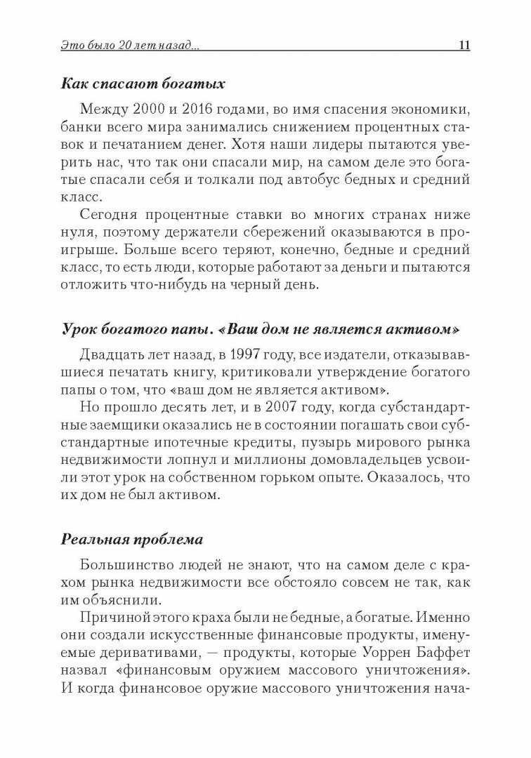 К 20-летию финансового бестселлера всех времен Роберт Кийосаки порадовал читателей новым изданием ставшей уже культовой книги - с изменениями и дополнениями для сегодняшнего мира, сегодняшних рыночных условий и 9 новыми разделами. К сожалению, за последних 20 лет в сфере образования мало что поменялось - в школе наши дети до сих пор не получают никаких финансовых знаний и потом всю жизнь работают ради денег, вместо того чтобы заставить деньги работать на себя. Научите детей обращаться с деньгами раньше, чем они столкнутся с материальными трудностями в нашем нестабильном мире!