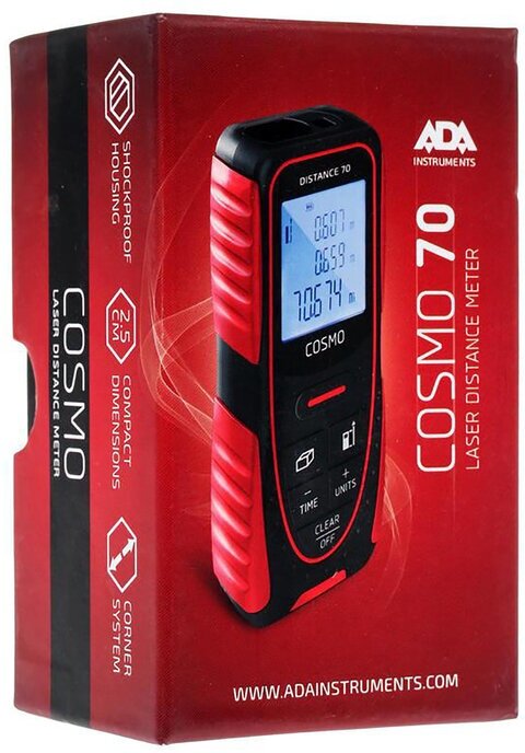 Лазерная рулетка ADA — это профессиональный лазерный дальномер, особенностью которого является простота и удобство в использовании. Главное достоинство этого профессионального прибора — измерение расстояний при любых условиях освещенности. Даже при ярком солнце ADA измеряет расстояние до 70 метров с высокой точностью. Максимальная погрешность измерения составляет всего 1,5 миллиметра.