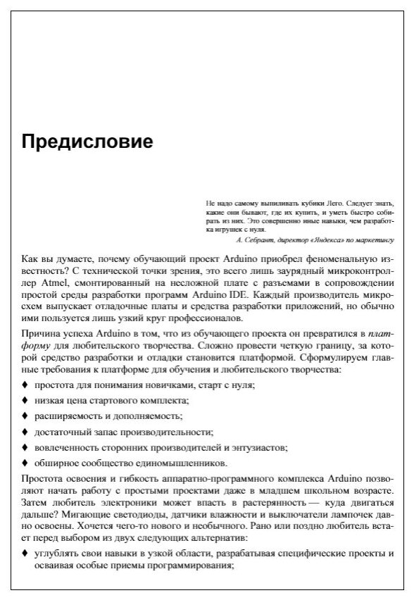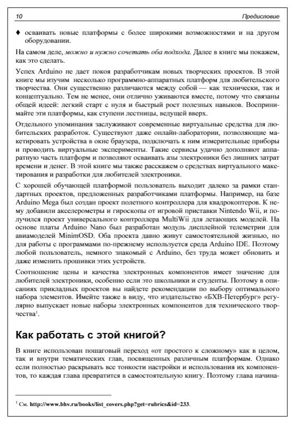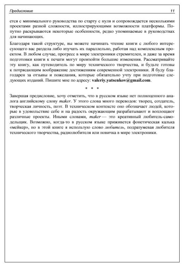 Полезная книжка, с удовольствием прочитал, и многие идеи из этой книжки "взял на карандаш", т.е. хочу использовать. Что в книжке хорошо - вот аппаратная платформа, характеристики, особенности; вот тут же IDE для работы с этой платформой; вот тут прочий полезный софт; вот тут можно эту платформу заказать; вот такие проекты можно на ее основе сделать. Причем автору удалось рассказать все это с нужной степерью подробности - не перегружая лишними деталями и не раздувая объем книги сверх необходимого. Но уровень книги рассчитан на хотя бы немного подготовленного читателя, имеющего хотя бы некоторый опыт в электронике; не на школьников и не на совсем новичков.