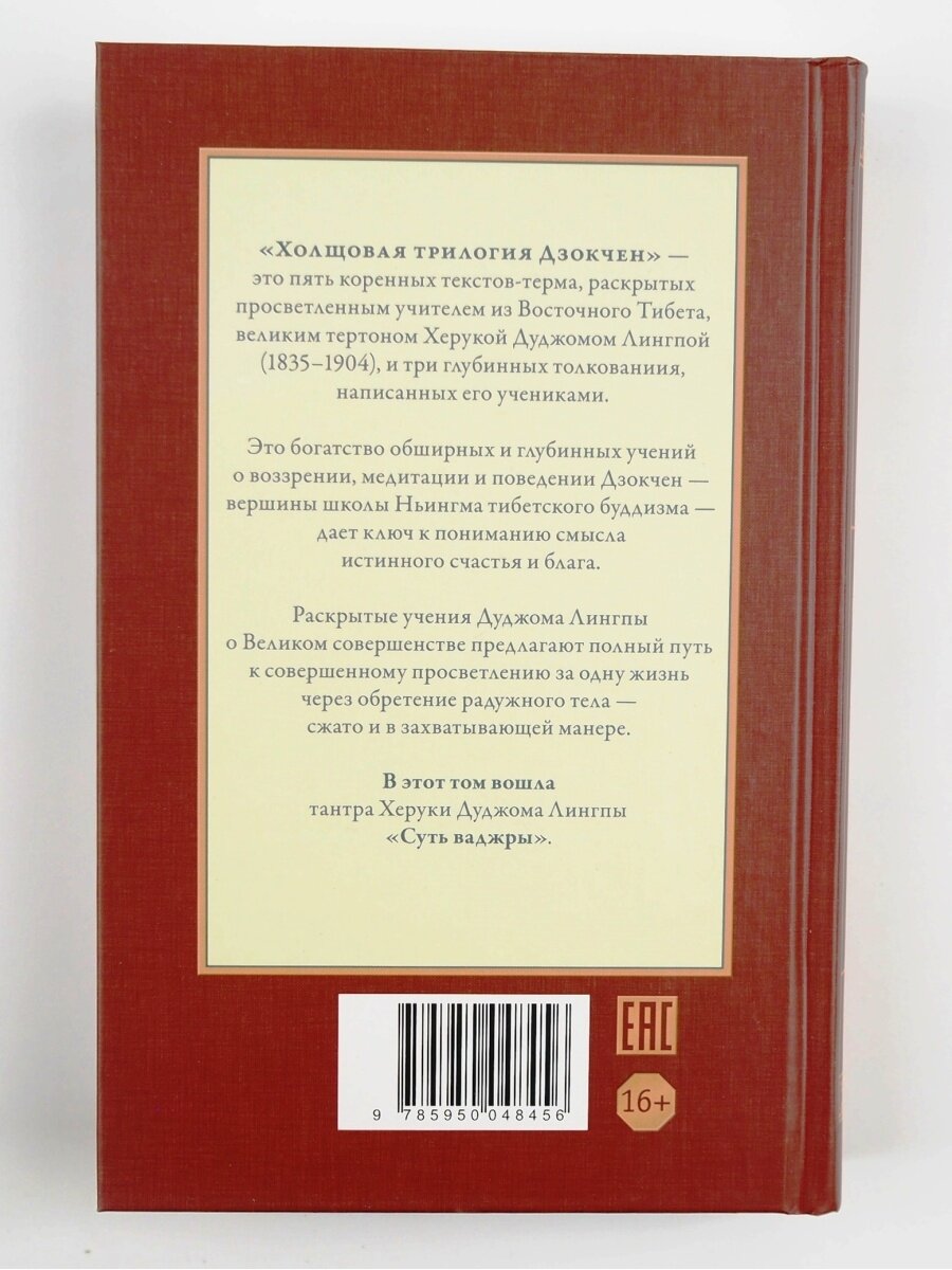 "Холщовая трилогия Дзокчен" - это пять коренных текстов-терма, раскрытых просветленным учителем из Восточного Тибета, великим тертоном Херукой Дуджомом Лингпой (1835-1904), и три глубинных толкованиия, написанных его учениками.