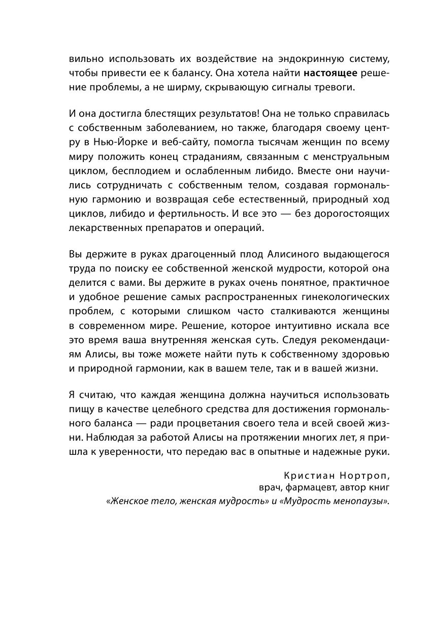 Автор этой книги - Алиса Витти, врач, консультант по вопросам здоровья, - страдала от синдрома поликистоза яичников. Сегодня этот диагноз ставят каждой девятой женщине, и медицина может только уменьшить симптомы. Алисе удалось победить болезнь самостоятельно, и теперь она готова помочь другим женщинам. У ее метода есть множество плюсов: с его помощью любая женщина улучшит фертильность, усилит сексуальность, справится с гормональными бурями и приливами, наладит свой цикл, забудет о болезненных менструациях. В книге приводится план питания, учитывающий фазы цикла, даны советы, какая тренировка эффективнее и чем заняться в эти фазы (от уборки до просьбы о повышении на работе). Вы будете жить и действовать согласно гормонам, сможете забеременеть, когда этого захотите. Вы наконец-то будете жить максимально полной жизнью.