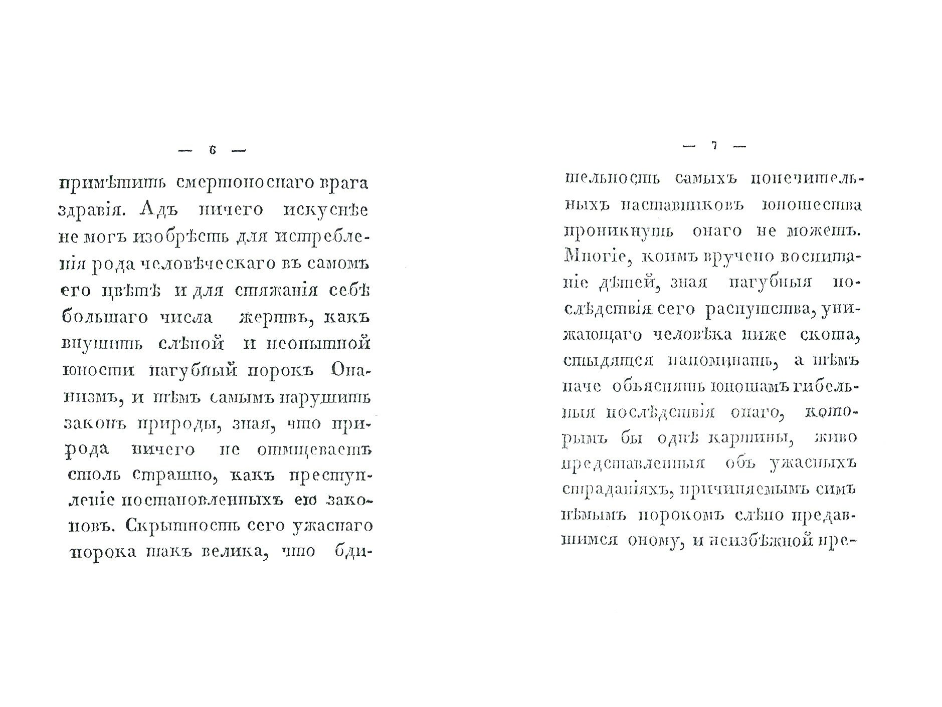 Оглавление: Предуведомление. - Что есть Онанизм? - Какие первые напоминовения природы, предавшимся сему пороку? - Какую печать кладет природа на преступников, предавшихся сему распутству? - Болезни сердца, Онанизмом причиняемые. - Признаки Онаниста. - Болезни, Онанизмом причиняемые. - Примеры. - Явления после смерти Онаниста. - О предосторожностях противу Онании. Серединский Василий Тимофеевич (1785-1852) - врач, из духовного звания. Учился в московском отделении Медико-Хирургической Академии, окончил курс лекарем в 1812 г. и поступил лекарем в Минский военный госпиталь; в следующем году был переведен в 54-й егерский полк; в 1816 г. получил звание штабс-лекаря; в 1819 г. поступил в 6-ю артиллерийскую бригаду; в 1824 г. перешел в гражданское ведомство Спасским уездным врачом (в Рязанскую губернию), но уже в следующем году вернулся в военное ведомство и служил в Казанском военном госпитале; в 1826 г. перешел в Казанский гарнизонный полк, где через год получил должность старшего врача; еще через два года вернулся в Казанский госпиталь; в 1838 г. был ординатором Георгиевского, и затем - Пятигорского военного госпиталя, в 1841 г. - в Екатеринодарском военном госпитале; вышел в отставку в 1844 г.