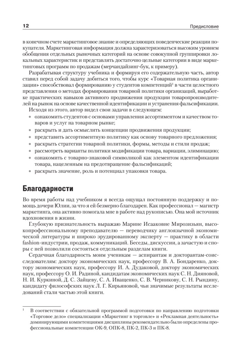 Учебник "Товарная политика организации" на сегодняшний день является первым полным, хрестоматийным изданием для студентов высших экономических учебных заведений, обучающихся по программе бакалавриата по направлению подготовки 38.03.06 "Торговое дело": профиль 38.03.06.02 "Маркетинг в торговле" и 38.03.06.03 "Рекламная деятельность".