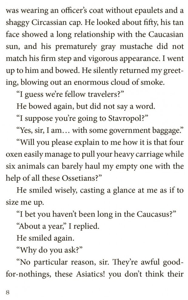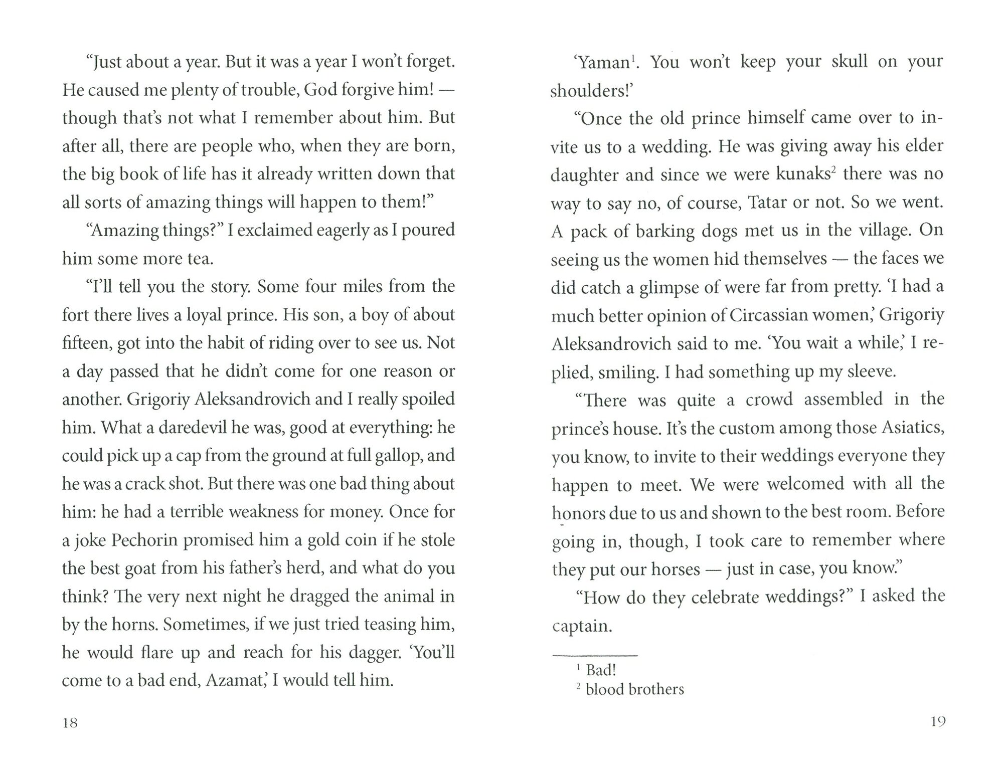 Очень непривычно было читать русскую классику на английском языке, но, неожиданно, оказалось очень интересно. Перевод хороший, сохранились все характеры персонажей, передача атмосферы тоже не пострадала, как это иногда бывает при переводе. Для меня прочтение "Героя нашего времени" на английском стало очень интересным опытом, сама книга приятная, как страницы, так и обложка. Тем, кто хочет подтянуть английский на уже знакомом произведении, точно понравится)