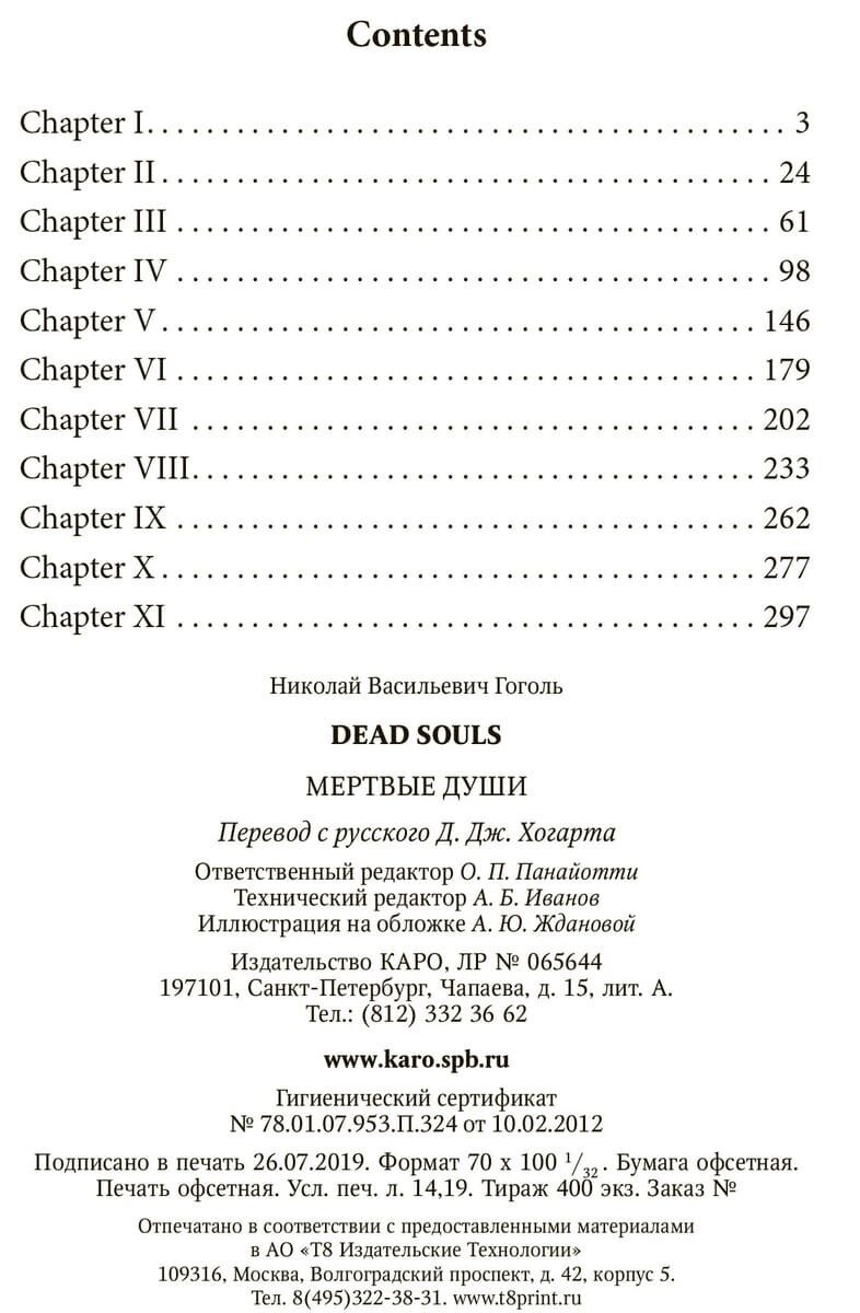 В общем, мне кажется, этот англоязычный вариант «Мёртвых душ» скорее будет интересен тем, кто занимается сравнительным анализом разных переводов или просто коллекционирует их. Как образец качественной переводческой работы эту книгу рассматривать нельзя.