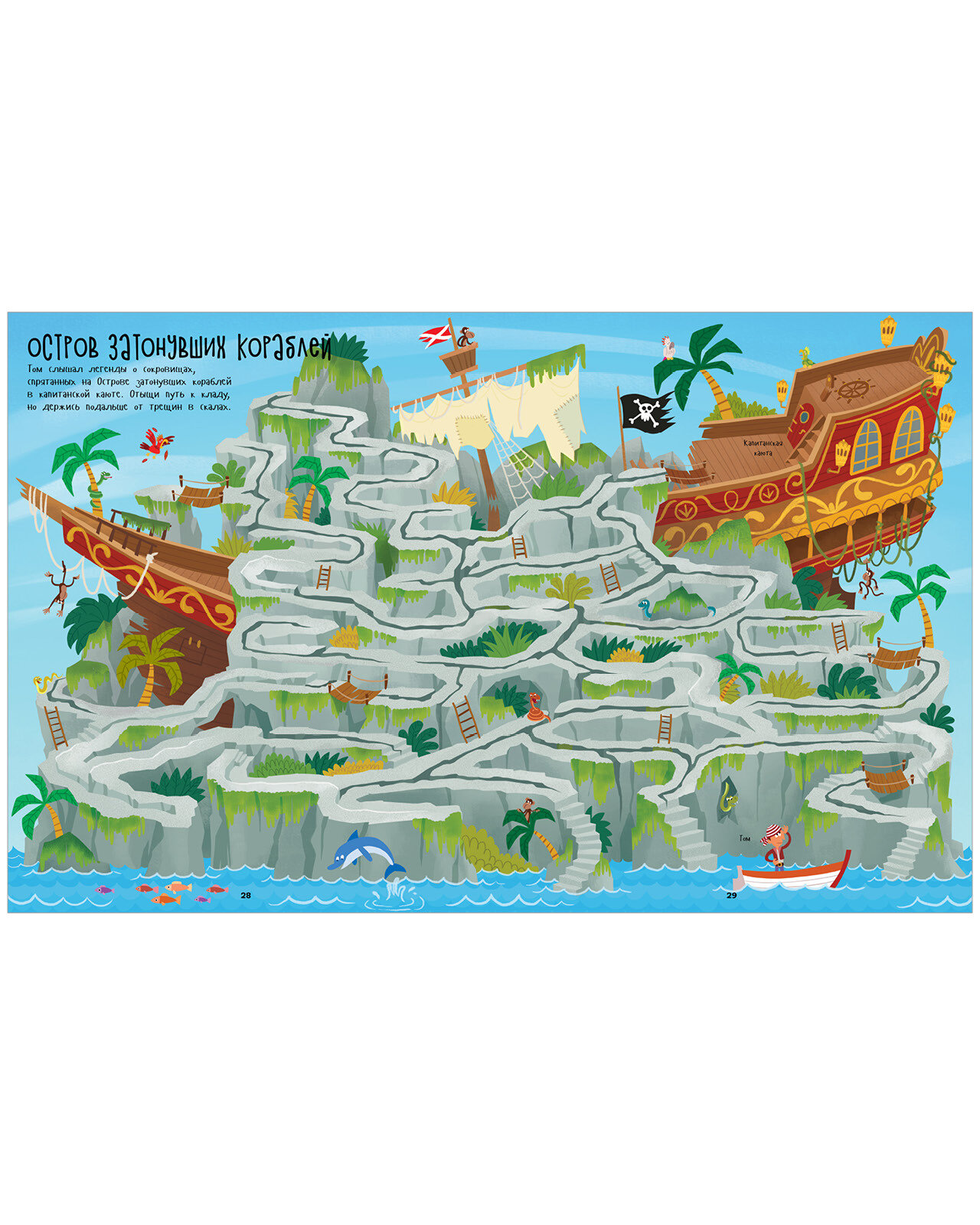 Вас ждет увлекательное путешествие в команде отважных пиратов: прокладывайте безопасный маршрут к сокровищам, учитесь ловить рыбу и варить уху, знакомьтесь с подводным миром, составляйте пиратскую карту и сражайтесь с морским чудовищем. В этой книге вы найдёте лабиринты на любой вкус.