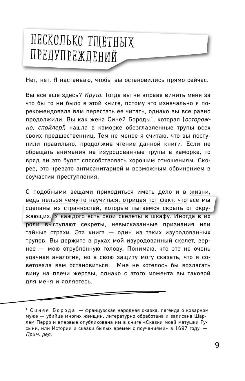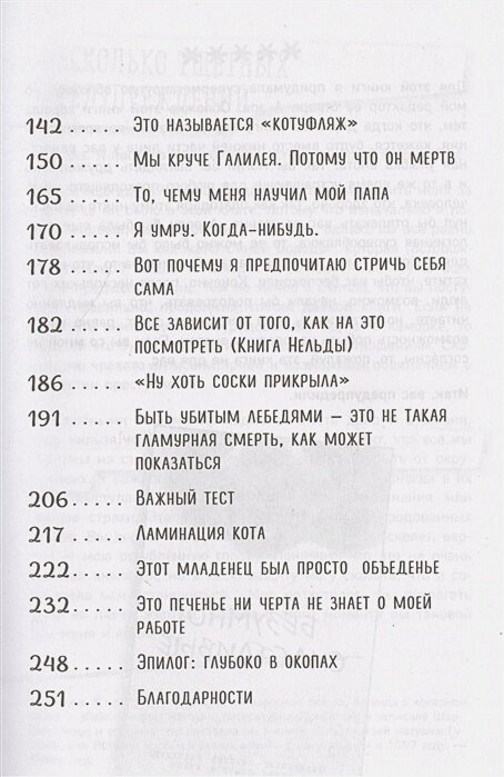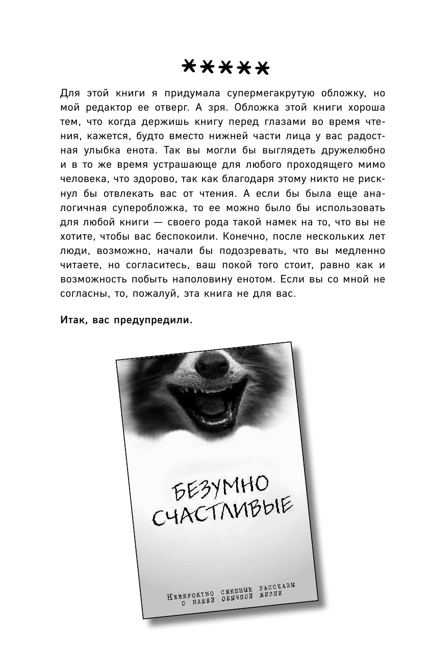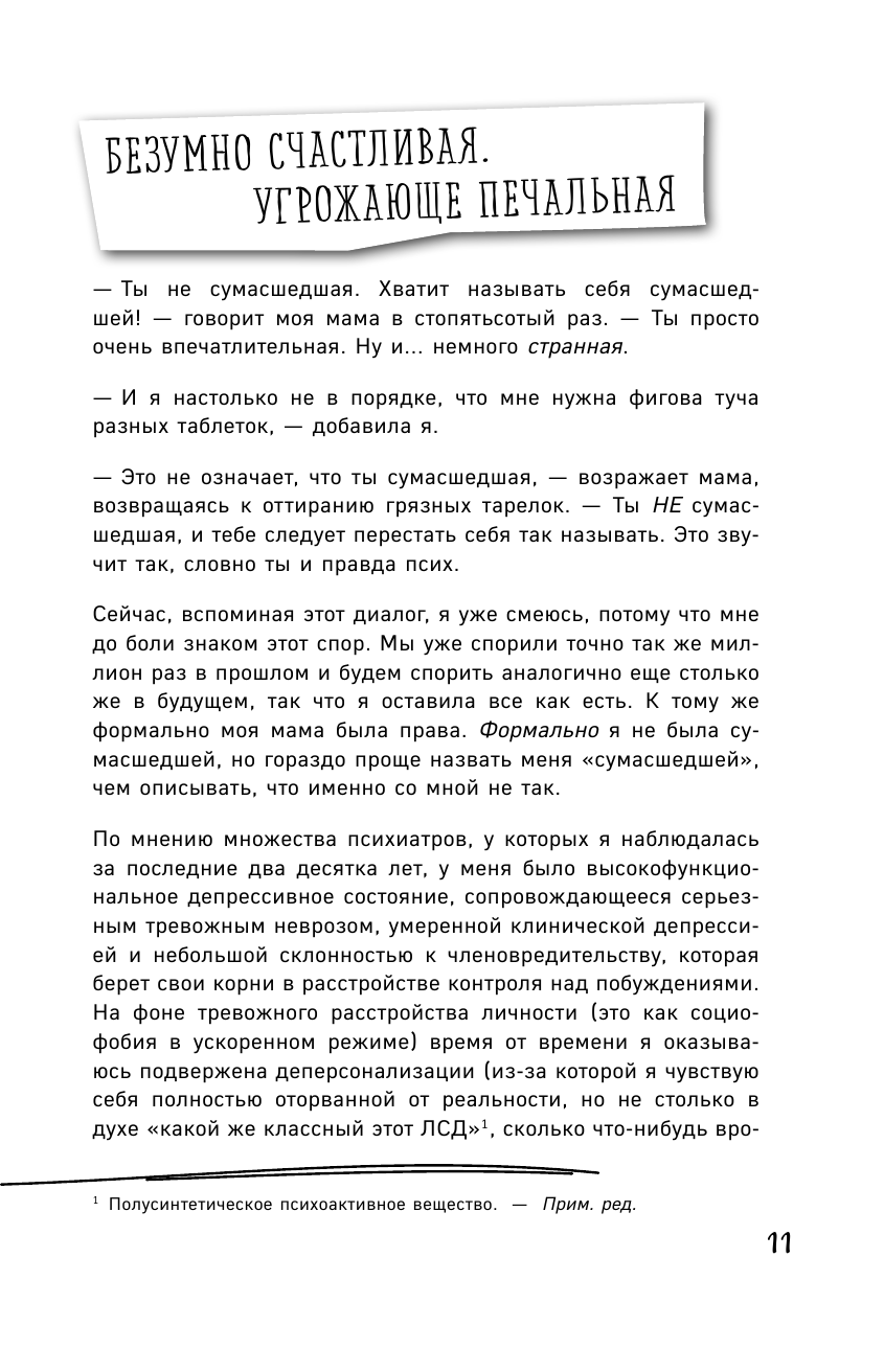 Эта книга - вторая часть бестселлера Дженни Лоусон "Безумно счастливые". Ждала от нее таких же сумасшедших историй, однако оказалось, что во второй части поднято гораздо больше серьезных тем. Например, в одной из глав автор рассказывает о том, как она переживает время, когда с ней, скажем так, не все в порядке. Эти главы без капли юмора или самоиронии, они обнажают самые темные страхи и трудности, с которыми Дженни сталкивается на протяжении своей жизни. Когда она описывает, как ее муж находит ее посреди ночи в ванной, сидящей на полу, с вырванными волосами и расцарапанными руками, становится немного жутко. Но вместе с тем приходит понимание, что автор - не просто сумасшедшая тетка, которая пошло шутит и говорит странные вещи, но и человек, по настоящему вызывающий сострадание и побуждающий радоваться тому, что имеешь, потому как если она преодолевает такие сложности, чтобы жить нормально, то нам и вовсе грех ныть. Ну а затем, конечно же, идет очередная глава с шутками про доктора-франкенштейна, мягко говоря, пикантным юмором и прочими штучками, которыми была богата и предыдущая книга.