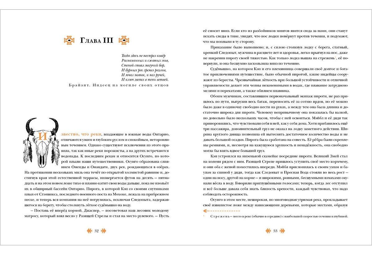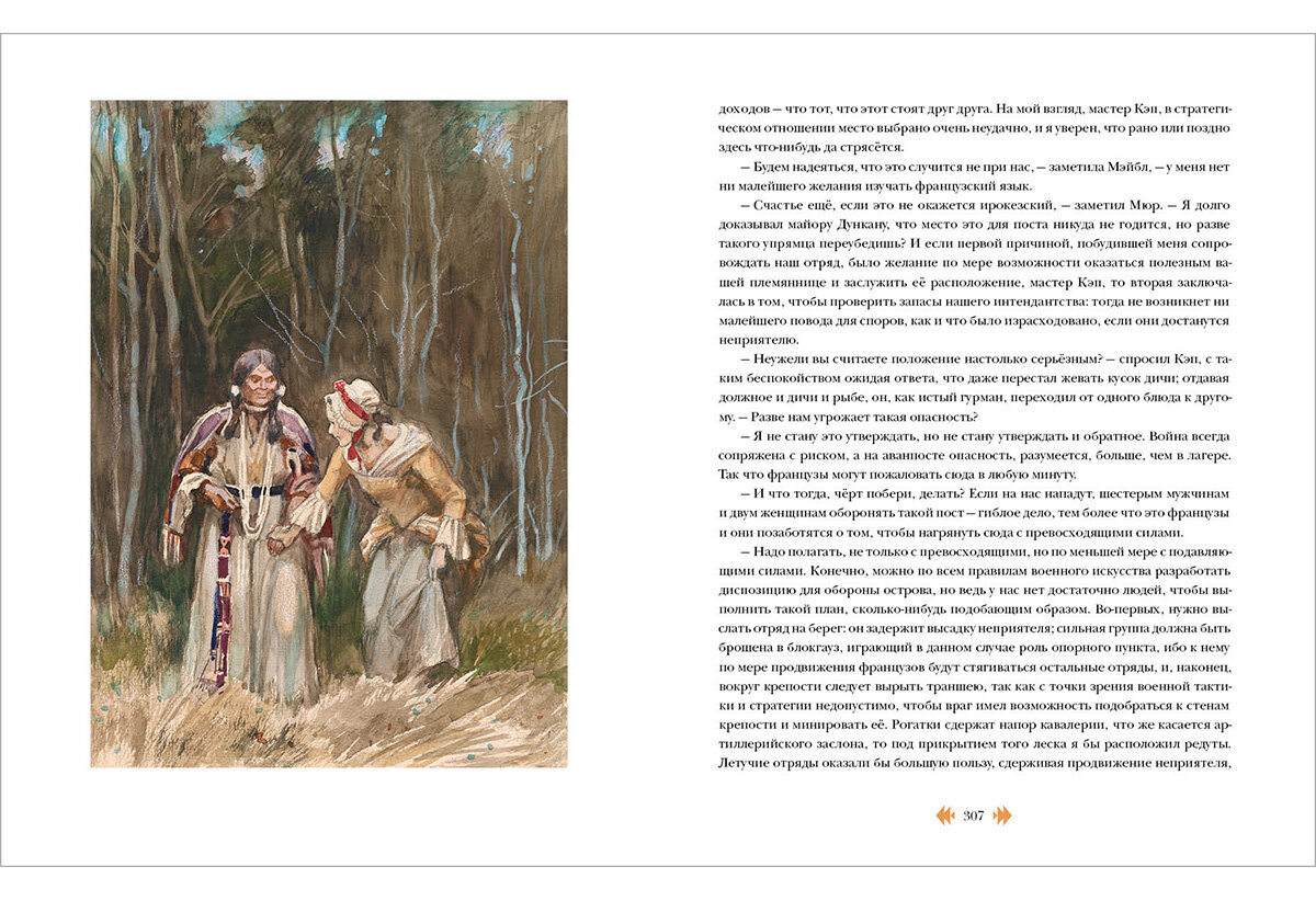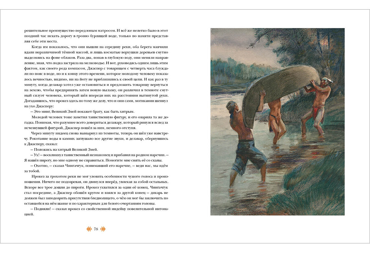 Я в детстве читала почти всего Купера, конечно, но это были неважные издания на коричневой бумаге в немудрящем исполнении. Поэтому книга Нигмы из серии «Страна приключений» стала приятной неожиданностью и пополнением домашней библиотеки. Сын, конечно, немного далёк от всей этой шумной романтики времён завоевания североамериканского континента, но немало заинтересовался, во многом благодаря иллюстрациям – не будь в издании картинок, текст бы его не привлёк.
