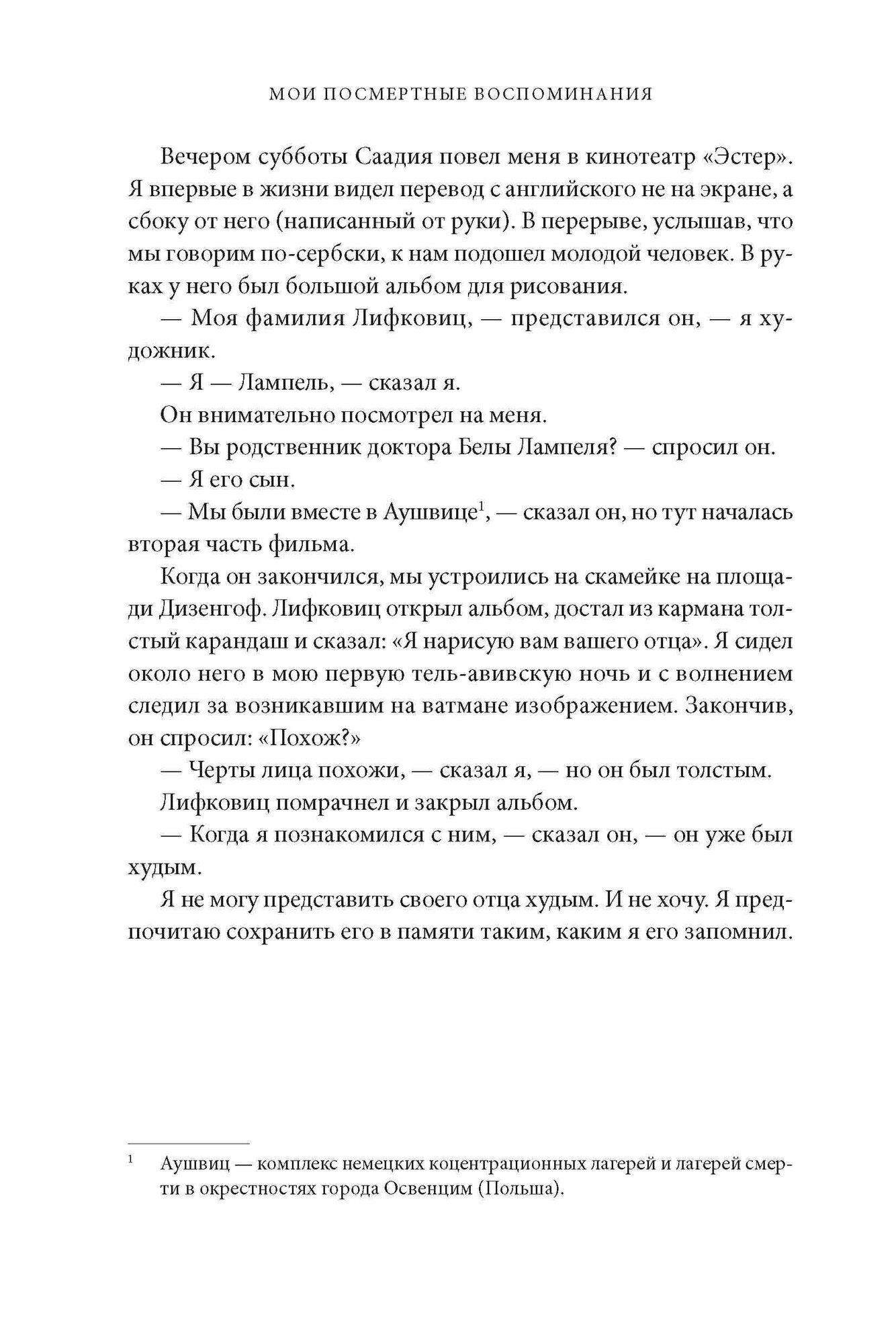 Прочёл с удовольствием книгу «Мои посмертные воспоминания» Яира Лапида , раньше ознакомился с английским вариантом текста, но русский перевод показался мне гораздо более совершенным и держал интригу чтения до последней страницы. Очевидно, качество перевода все-таки сыграло решающую роль для меня - спасибо за это переводчику( или переводчикам). Что касается сути предмета , то книгу я бы оценил как энциклопедию по курсу истории Израиля и Холокоста, блестяще воспроизведенную от лица великого Томми Лапида!