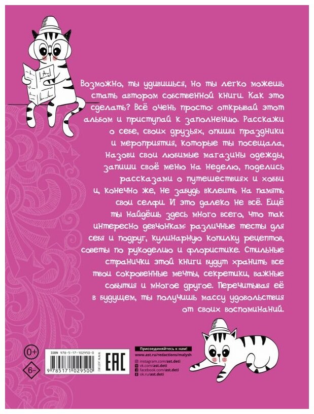 У тебя в руках очаровательный альбом, которому ты можешь доверить все свои самые сокровенные тайны, поделиться планами и мечтами, эмоциями и тёплыми воспоминаниями, вклеивая свои лучшие фотографии и отмечая важные даты и события. Создай целую историю о себе: опиши свои любимые увлечения и мероприятия, которые ты посещала, сделай страничку о моде и собственном стиле, заполни анкеты своих друзей. Кроме того, здесь тебя ждут интересные тесты, рецепты оригинальных блюд и советы по рукоделию. Этот альбом - настоящее сокровище для самой лучшей девочки, ведь с ним память о наиболее приятных моментах твоей жизни останется навсегда!